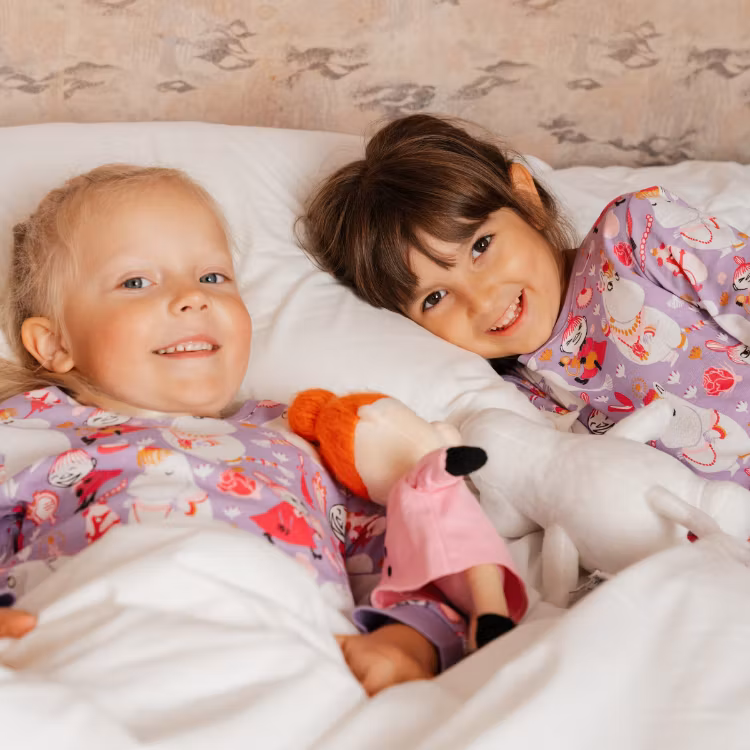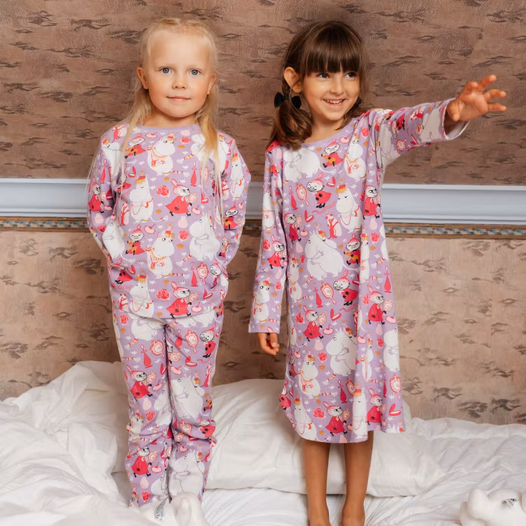 En tvådelad Mumin pyjamas för barn. Med långa ärmar och en rund halsringning. Byxan har infälld resår i midjan.