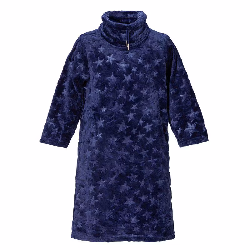 Mysig fleeceklänning för barn med stjärnstrukturmönster. Stor krage med dragsko och sidosömsfickor. Längd: 78 cm i storlek 110/116