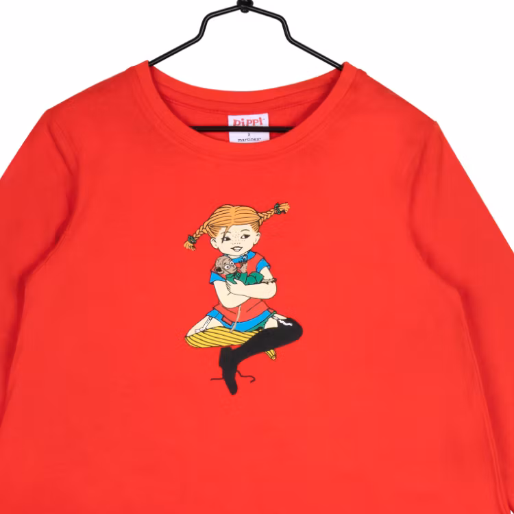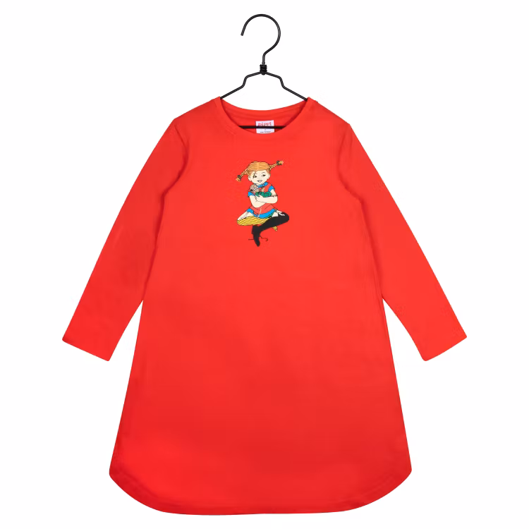 Ett mjukt och skönt nattlinne i knallrött, med ett rubbertryck av Pippi Långstrump framtill. Nattlinnet har lång ärm, rund halsringning och vackert rundad nederkant.