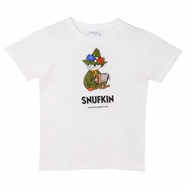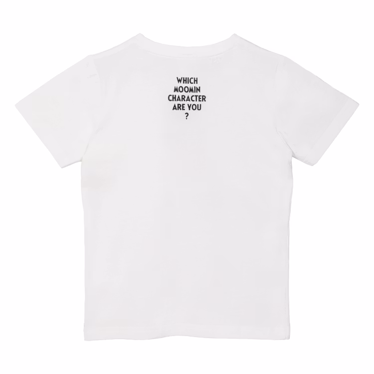 En fin Mumin t-shirt för barn. T-shirten är benvit, i rak modell med kort ärm och rund halsringning. I nacken finns frågan 'Which Moomin character are you?' och framtill finns det engelska namnet på favoritfiguren, tillsammans med en bild på den. Tillverkad i 100% bomull. Öko-tex.
