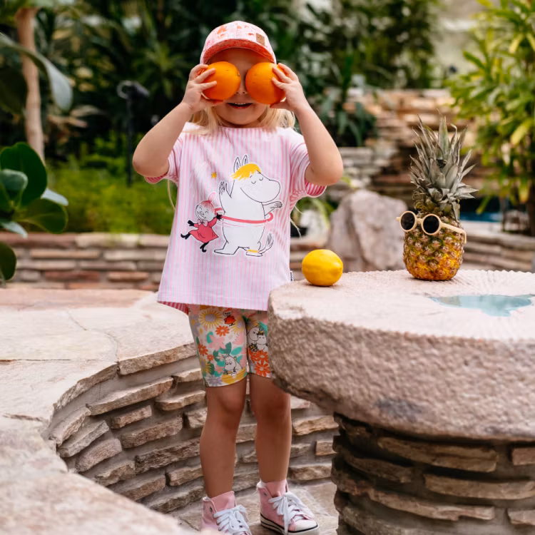 En mjuk och skön Mumin t-shirt för barn, vitrosarandig med ett stort rubbertryck av Lilla My och Snorkfröken som dansar. Rymlig modell med rund halsringning och kort ärm med nedhasad axelsöm. Produkten innehåller certifierad ekologisk bomull.