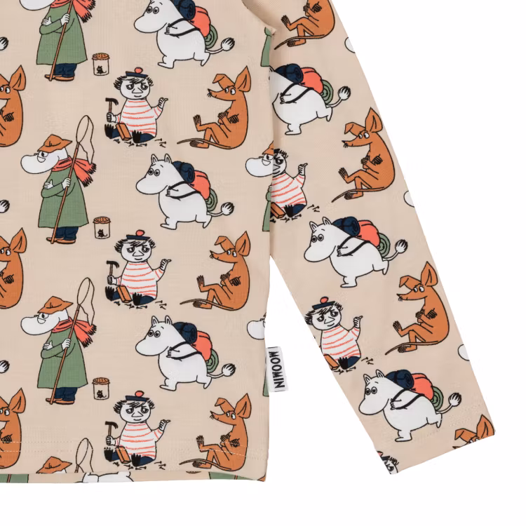 En mjuk, muminmönstrad barntröja tillverkad i 95 % certifierad ekologisk bomull och 5 % elastan. Rak modell med lång ärm och rund halsringning. Öko-tex. Designad i Finland.