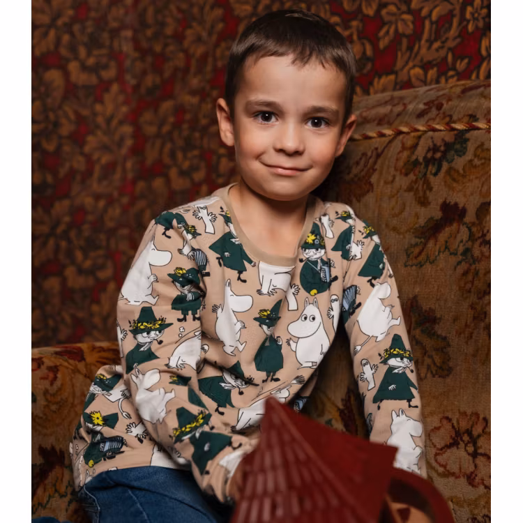 En mjuk och skön Mumin tröja för barn. I rak modell med långa ärmar och en rund halsringning. Produkten innehåller certifierad ekologisk bomull. Öko-tex.