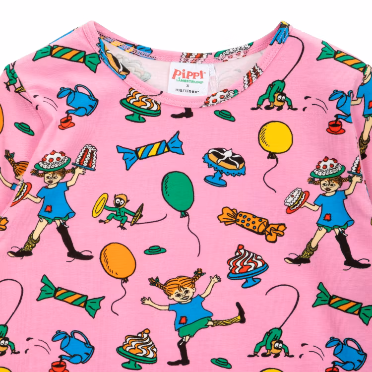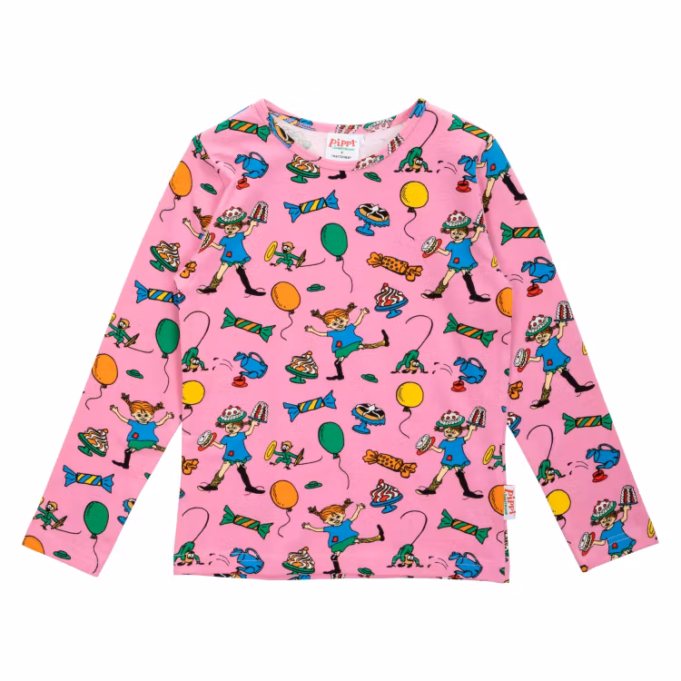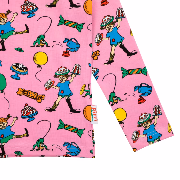 En mjuk och skön Pippi Långstrump-tröja för barn. Rosa och festligt helmönstrad, i rak modell med lång ärm och rund halsringning. Produkten innehåller certifierad ekologisk bomull. Öko-tex.