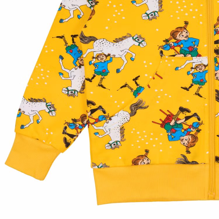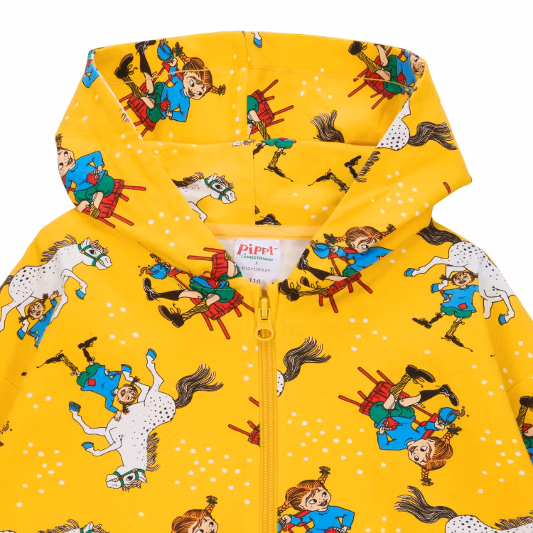 En mjuk och skön Pippi munkjacka för barn. Med långa ärmar, fodrad huva, fickor och ett långt blixtlås. Produkten innehåller certifierad ekologisk bomull.