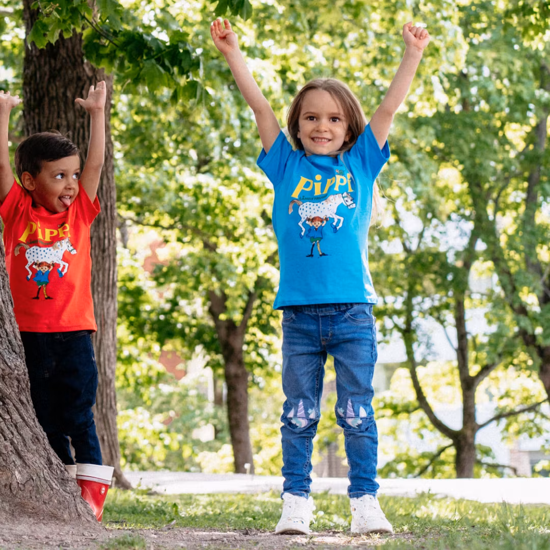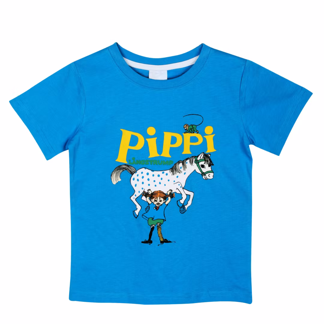 En rosa t-shirt för barn. Rak modell med korta ärmar, rund halsringning och en bild av Pippi Långstrump och Lilla Gubben. Produkten innehåller certifierad ekologisk bomull.