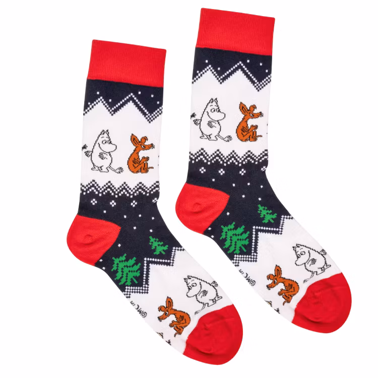 Ett par jul- och vinterinspirerade strumpor med muminfigurer i bergen, bland granar och snö. Strumporna har röda tår, hälar och resårkanter på skaften. Öko-tex.