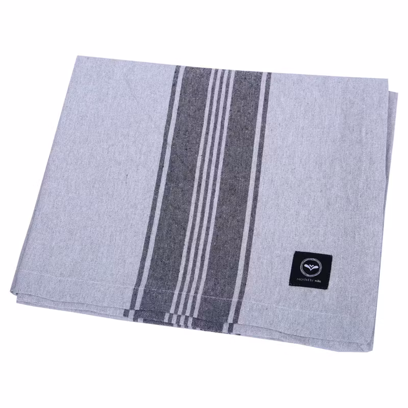 Med denna stilfulla randiga bordsduk från Recycled by Wille kan du få en sofistikerad dukning. Duken ingår i en serie bordsdukar i olika modeller och färger och detta är en rektangulär modell med ett mått på 140x240/350 cm och en elegant ljusgrå färg med dekorativa mörkgrå ränder. Den passar lika bra till vardags som vid finare tillfällen och piffar upp ditt bord samtidigt som den skyddar bordsytan. Bordsduken är tillverkad i 80% bomull och 20% polyester – där 99% av den textil som används är återvunnet material.