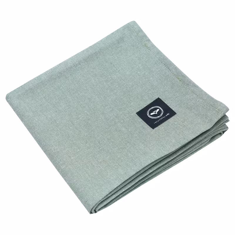 Hedvig från Recycled by Wille, klassisk bordsduk i återvunnet grönt chambraytyg. Duken är tillverkad i återvunnen bomulls-/polyestermix samt behandlad med en nedbrytbar akrylatlösning som skyddar mot smuts och väta och gör duken lätt att torka av.