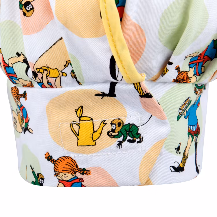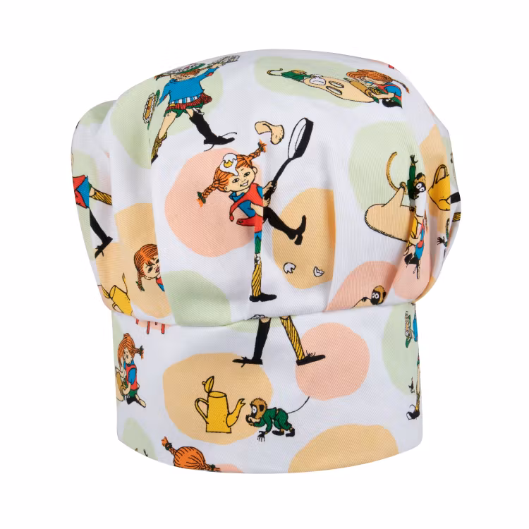 En härlig kockmössa för barn. Kockmössan är sydd i vit bomull och den är helmönstrad med färgglada Pippi Långstrump som bakar mumsiga tårtor. Den stadiga kanten är ca 6,5 cm hög och omkretsen är 50 cm men storleken går att justera med kardborrefastsättningen baktill. Tvättas med liknande fäger max 40°C