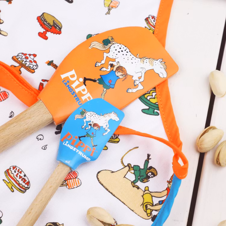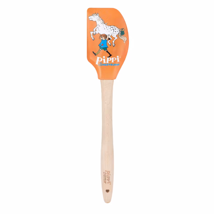 En Pippi Långstrump slickepott med ett orange silikonblad, dekorerat med en bild av Pippi som bär på Lilla Gubben. Slickepotten har ett runt träskaft med ett hål för upphängning på tunn krok. Handdisk rekommenderas. Max 40°C. Levereras i pappställ.