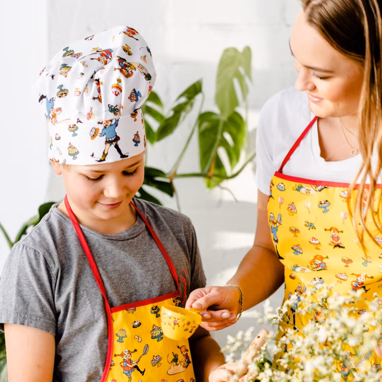 En härlig kockmössa för barn. Kockmössan är sydd i vit bomull och den är helmönstrad med färgglada Pippi Långstrump som bakar mumsiga tårtor. Den stadiga kanten är ca 6,5 cm hög och omkretsen är 50 cm men storleken går att justera med kardborrefastsättningen baktill. Tvättas med liknande fäger max 40°C.