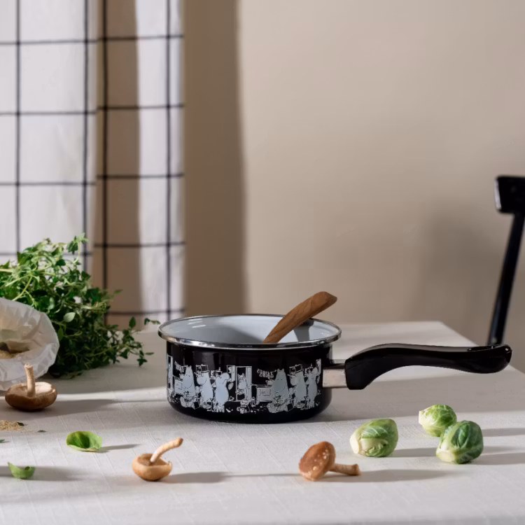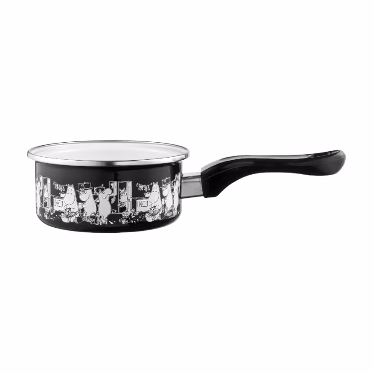 Mumin emaljkastrull 1 L från Muurla är perfekt för matlagning på olika värmekällor och pryds av ett mönster skapat av Tove Jansson. Med en slitstark kolstålskärna och dubbel emaljbeläggning är den både robust och lätt att rengöra. Kastrullen passar alla hällar, från induktion till öppen eld, och kombinerar funktion med en charmig estetik i köket.