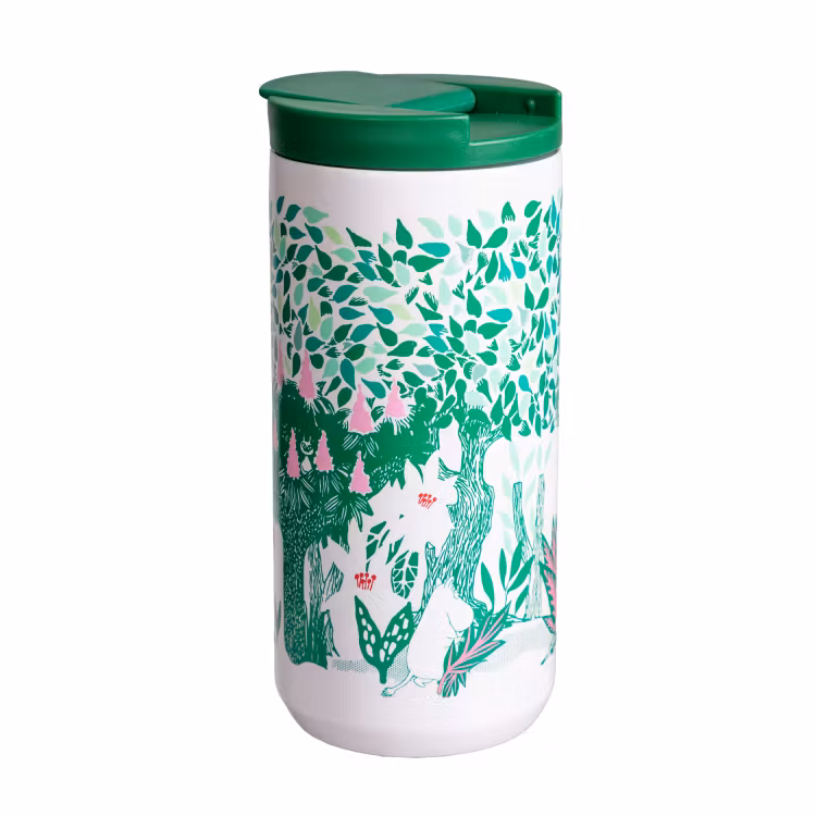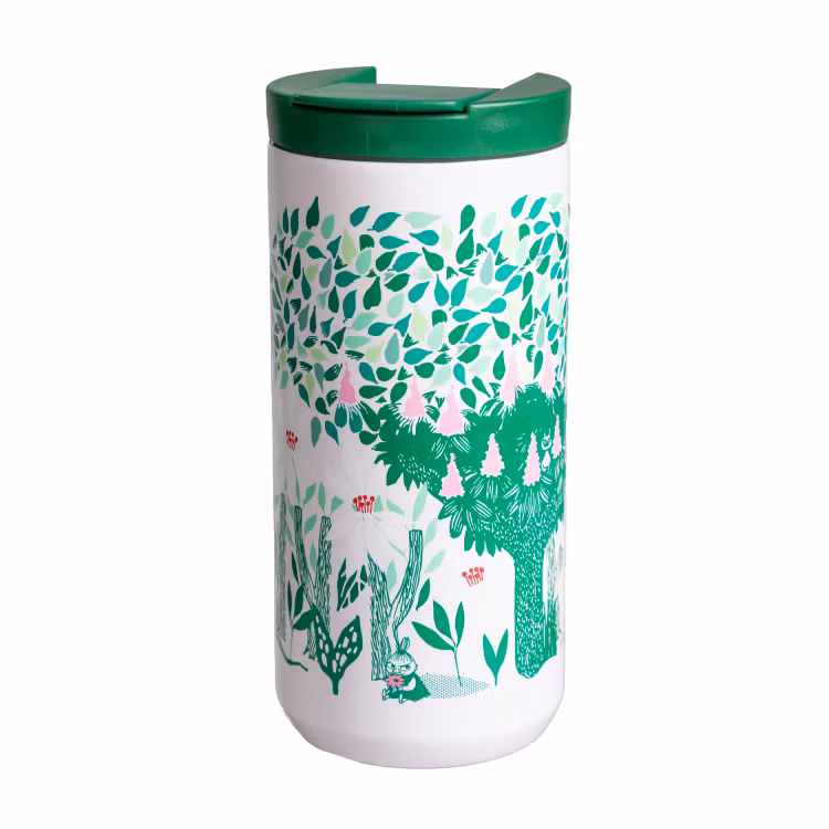 En termosmugg i stål med lock. Muggen är prydd med rosa och grönt muminmotiv där välbekanta muminfigurer spenderar en försommardag i en blommande kastanjeskog. Muggen rymmer 4,5 dl, den har en silikonring i botten för bra fäste och ett tättslutande skruvlock i BPA-fri PP-plast med silikontätning. Lyft på den tättslutande fliken i locket för att dricka. Håller drycken varm i 2 h eller kall i 7 h. Handdisk rekommenderas. Ej för mikrovågsugn.