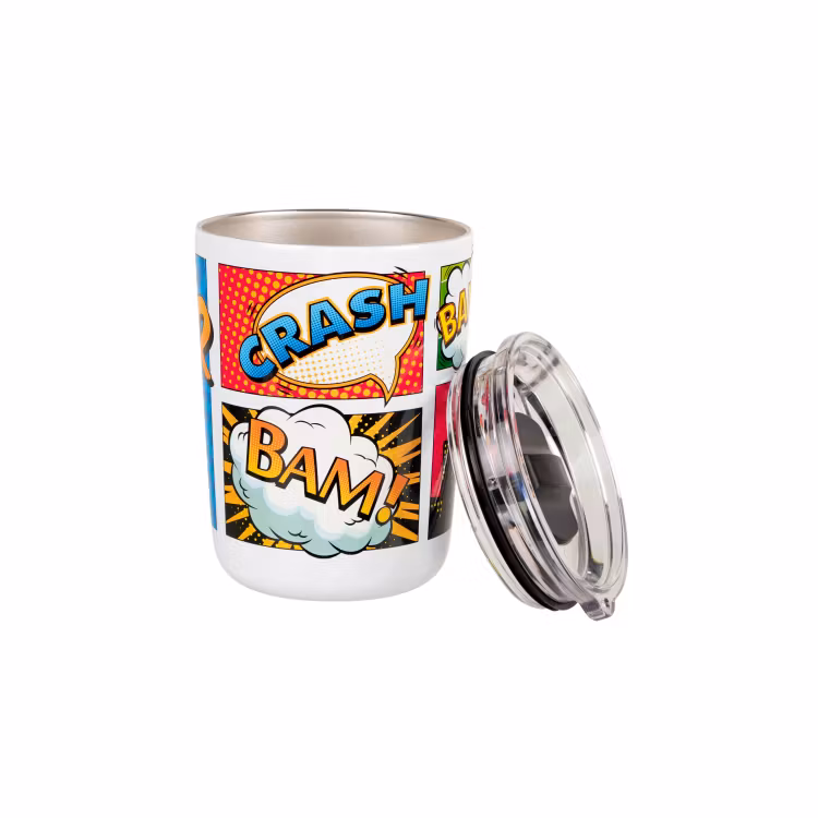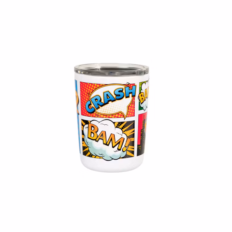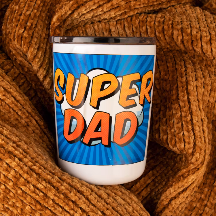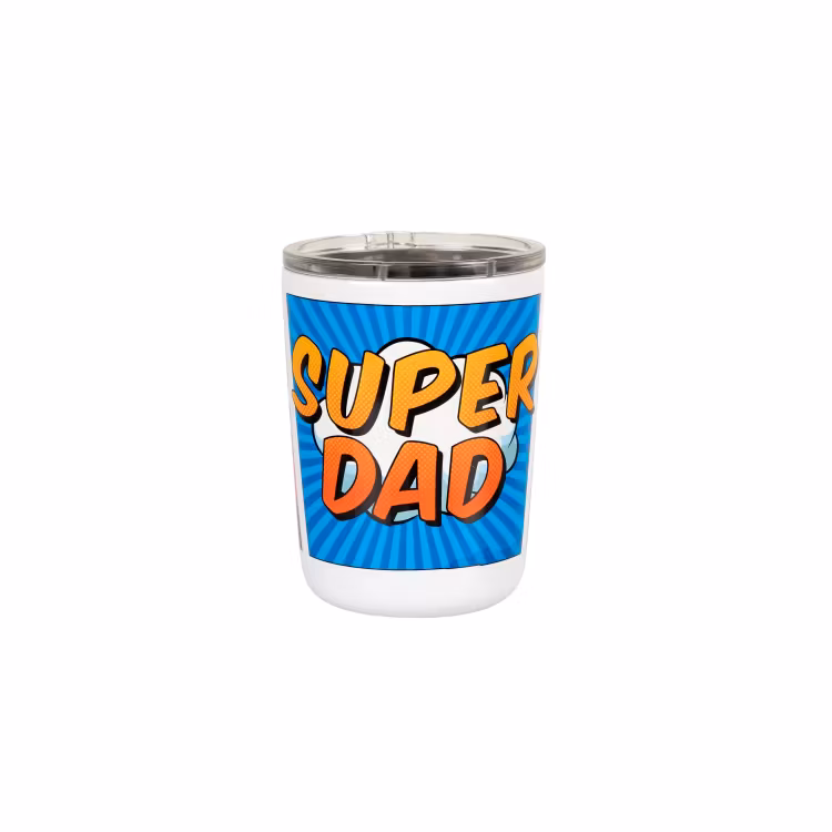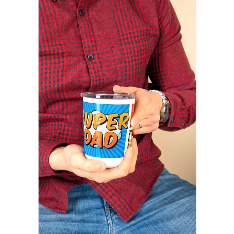 En färgglad termosmugg fylld av action. Motivet är tecknat i serieteckningsstil med texten 'Super Dad' på framsidan. Perfekt till fars dag eller som present till pappa då du vill påminna honom om hur super han är. Muggen är av rostfritt stål och locket PS-plast. Rymmer 3,9 dl. Håller drycken kall i 7 timmar och varm i några timmar. Handdisk rekommenderas.