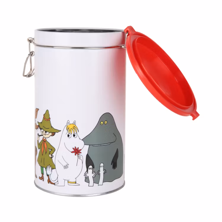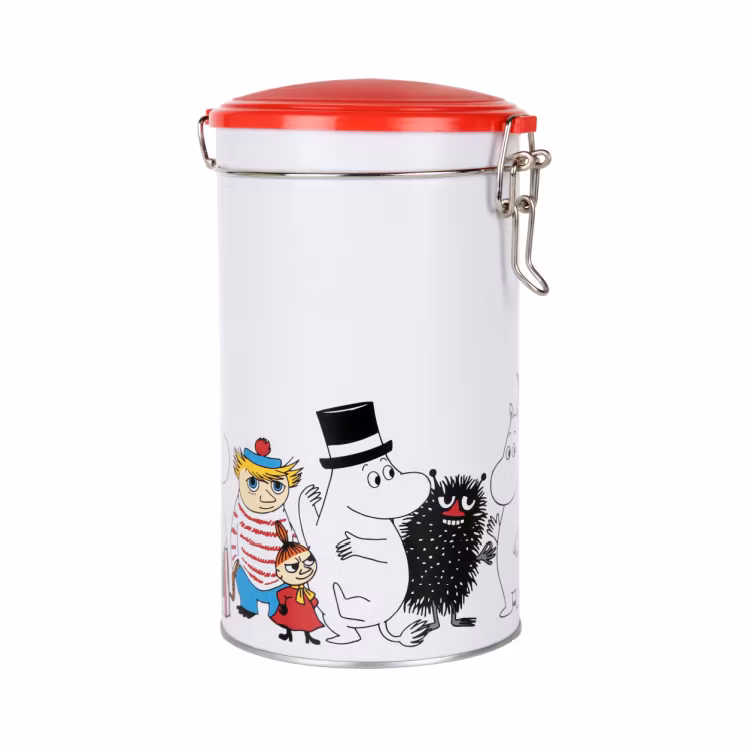 Rund, vit plåtburk med en lång rad härliga muminfigurer i kanten nedtill. Burken har ett rött, tättslutande snäpplock i plast. Höjd 20 cm. Handdisk. Noggrann torkning.