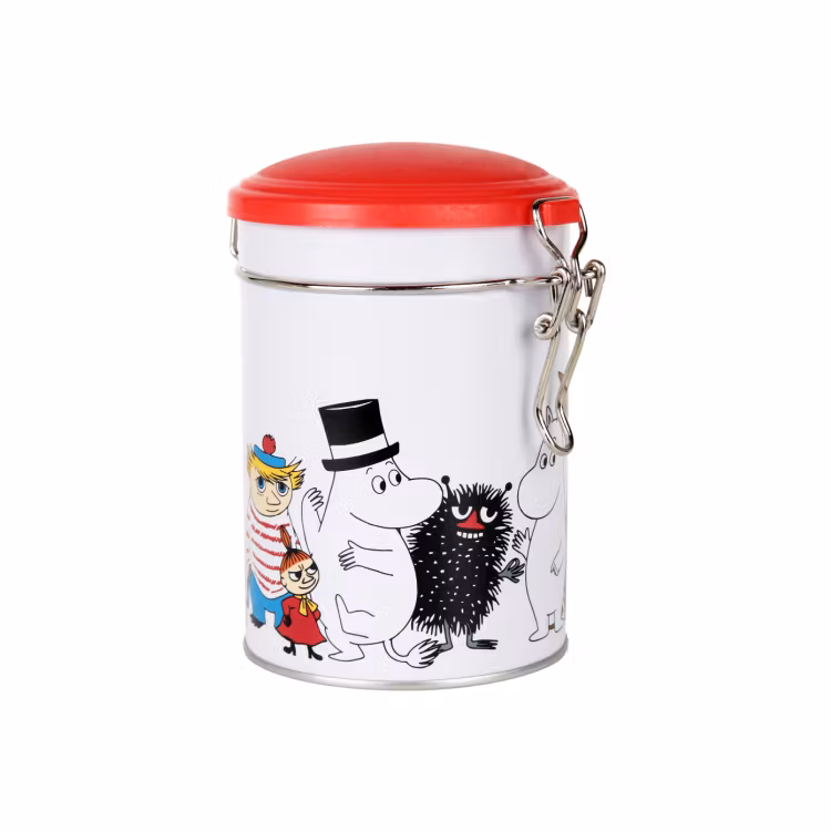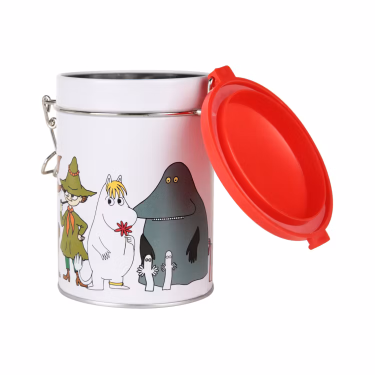 Rund, vit plåtburk med en lång rad härliga muminfigurer i kanten nedtill. Burken har ett rött, tättslutande snäpplock i plast. Höjd 13 cm. Handdisk. Noggrann torkning.