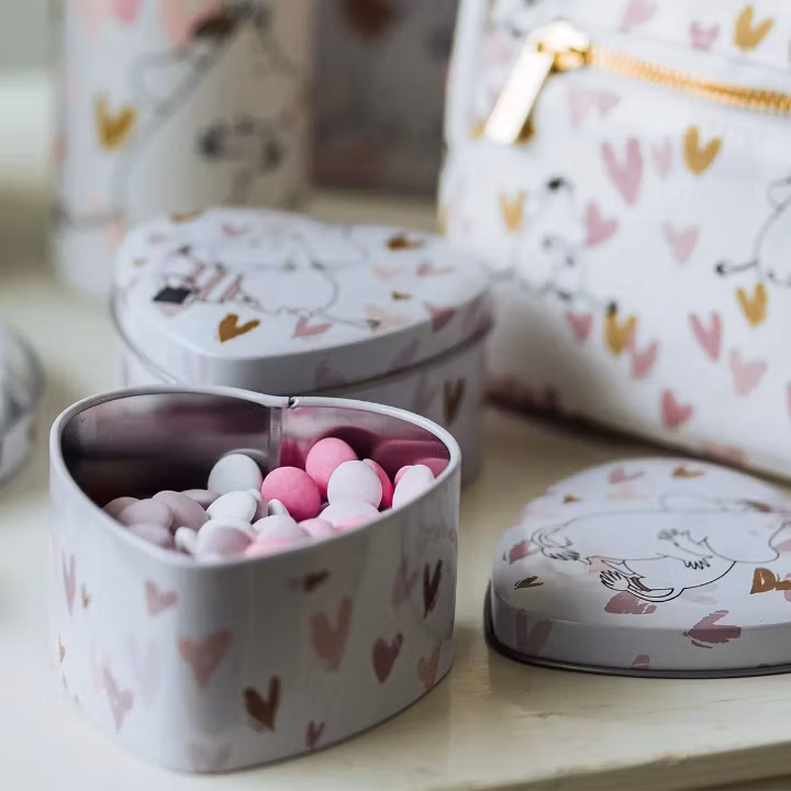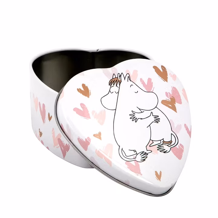 Gullig liten hjärtformad plåtburk med kärleksfullt Muminmotiv.