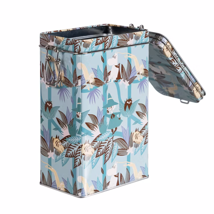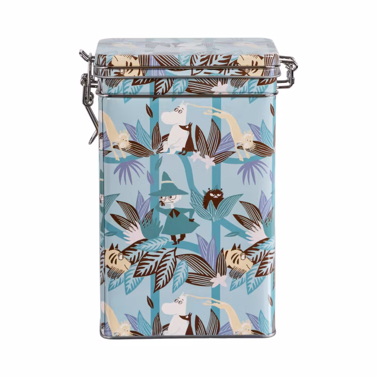 En kaffeburk som dekoreras av ett Mumin Trädkrona-motiv i blågröna nyanser. Välbekanta muminfigurer kikar fram bland trädtopparna i djungeln i detta motiv. Kaffeburken har ett lufttätt lock och spännlås. Rymmer ett 500 grams kaffepaket. Handdisk och noggrann torkning.