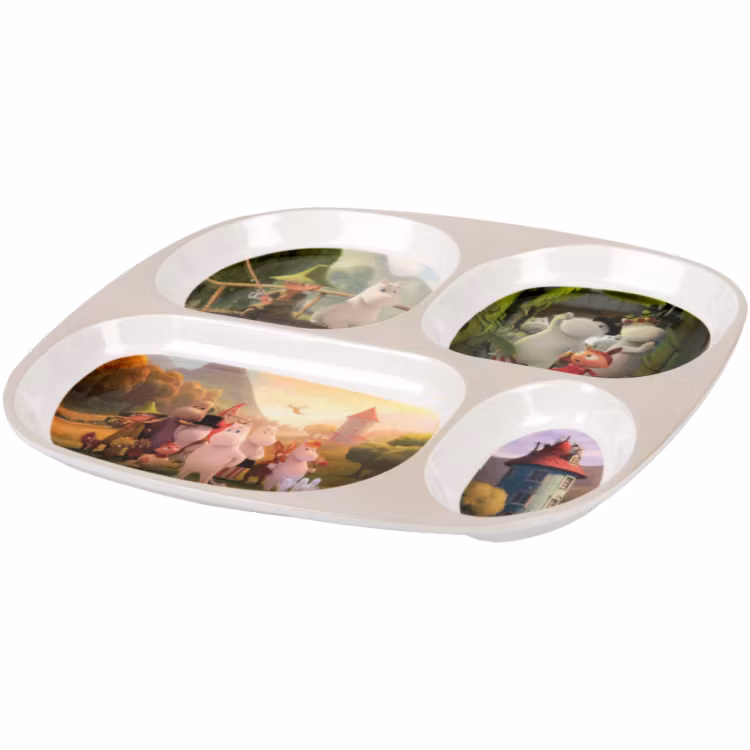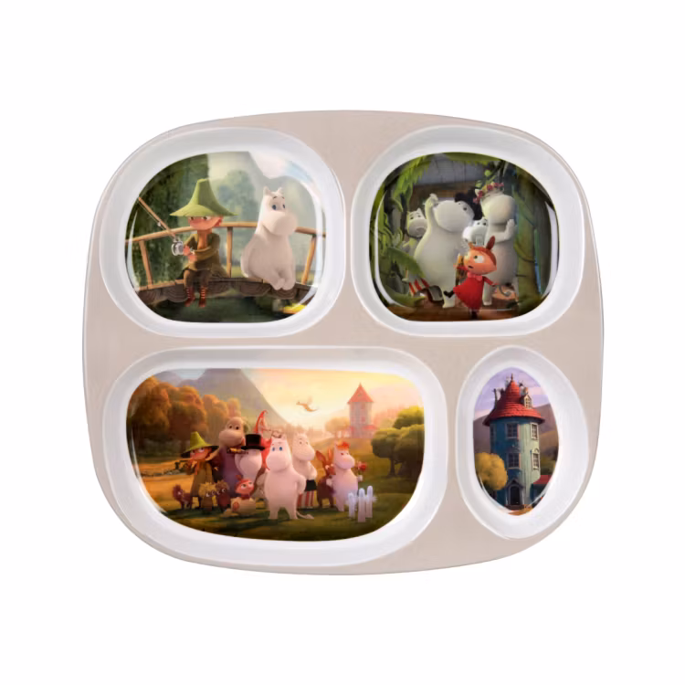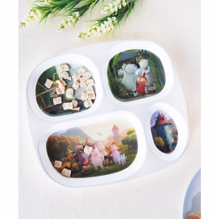 Melamintallrik med 4 sektioner. Introducera nya smaker till familjens yngsta och låt barnet plocka i sig mat med fingrarna ur de olika facken. I botten på varje sektion finns det en fin bild på Mumintrollet med familj och vänner, i härliga färger och motiv från den nya tv-serien Mumindalen. Handdisk rekommenderas. Tål ej mikro.