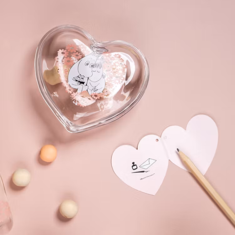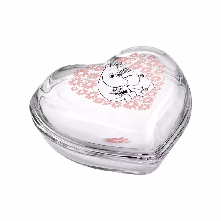 Med Mumin glasburk med lock "Tillsammans rosa" får du en hjärtformad skål som är både praktisk och dekorativ. Den passar perfekt för att förvara smycken, servera godsaker eller hålla ordning på små leksaker. Glasburken, som mäter 5,5 cm på höjden och 11,5 cm i bredd, har ett fint Muminmotiv på locket och levereras i en vacker presentförpackning.