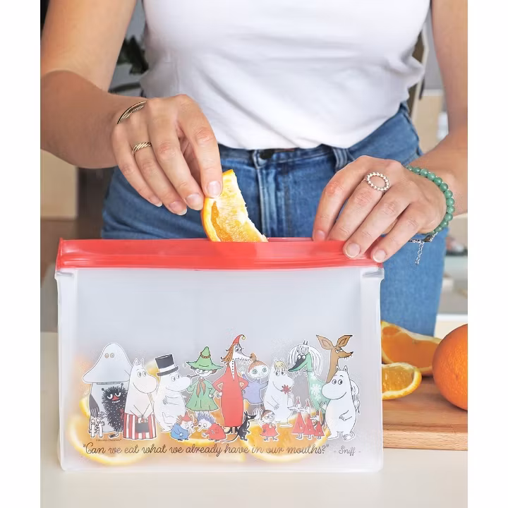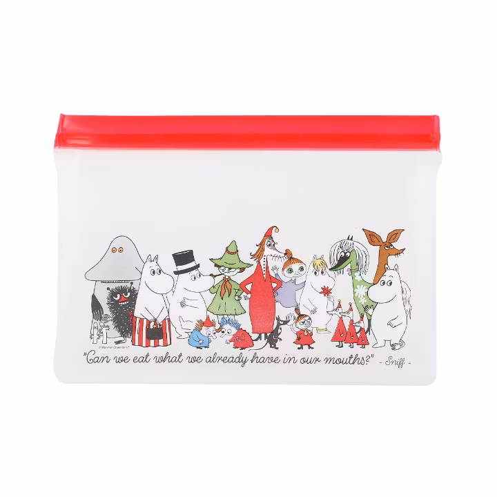 En förvaringspåse tillverkad i BPA-fri, livsmedelsklassad peva-plast. Påsen är färgglatt dekorerad med det glada mumingänget ovanför texten 'Can we eat what we already have in our mouths?' -Sniff-. Påsen är återförslutningsbar med ziplås och den tål frys eller värme upp till 50 grader. Handdisk rekommenderas