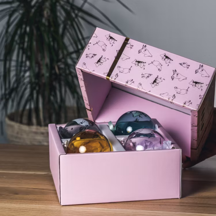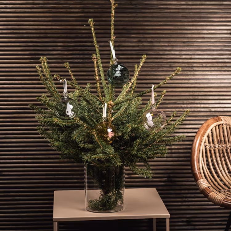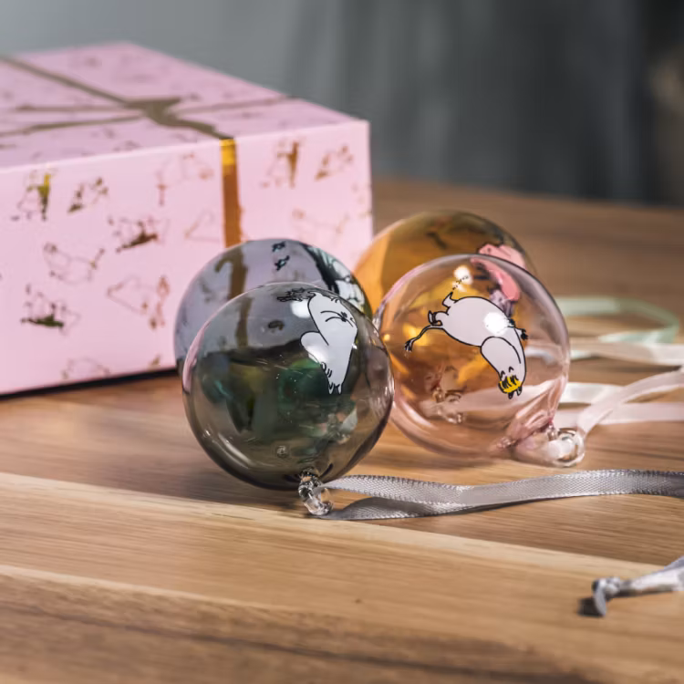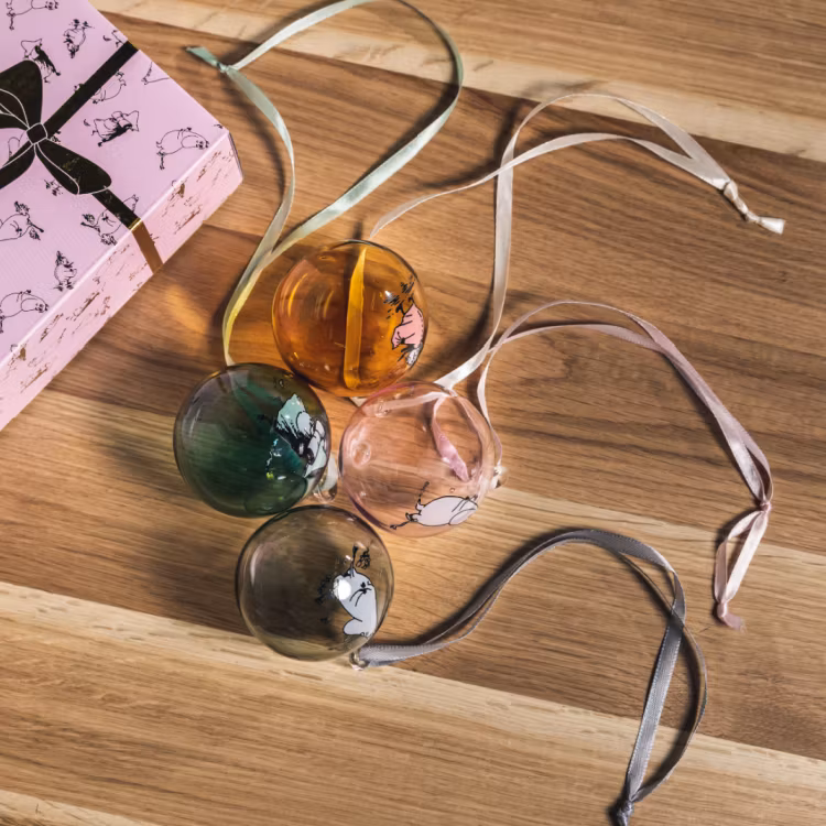 Skapa en mysig atmosfär med mumindekorationsbollarna! Kommer i en presentförpackning om fyra delar. Munblåst av blyfritt glas. Designad i Finland.