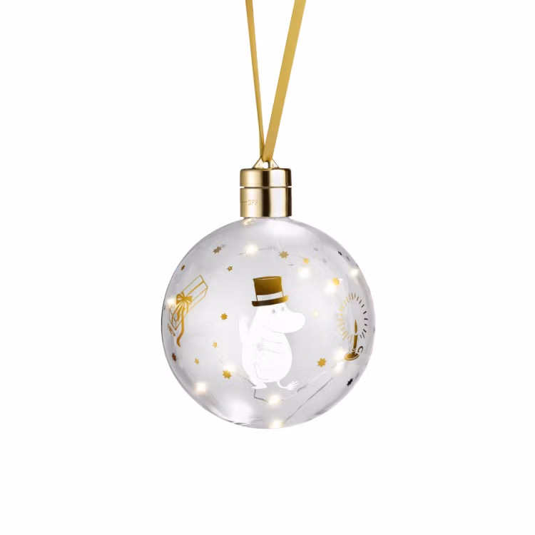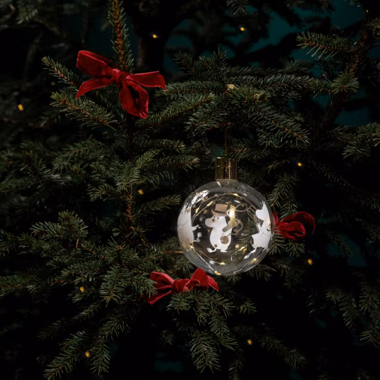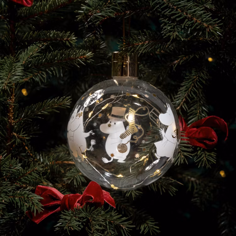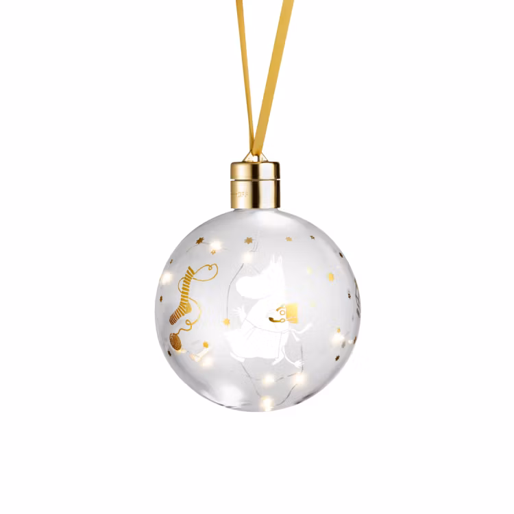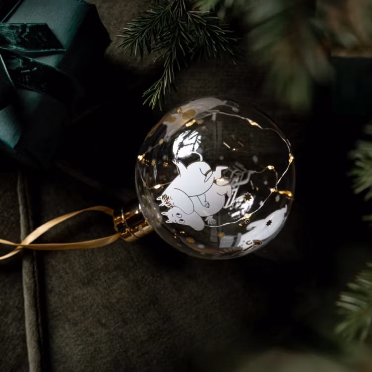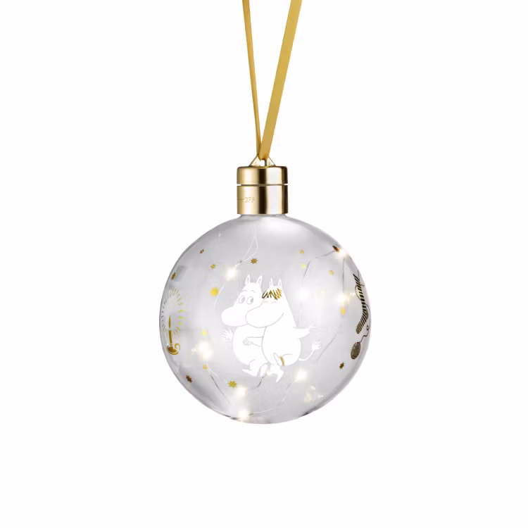 Mumin kula med LED-ljus Gnistrande stjärnor från Muurla är en förtrollande dekorationskula som sprider ett stämningsfullt ljus i ditt hem. Med en diameter på 11 cm och en inbyggd ljusslinga med 10 LED-lampor, skapar den ett varmt sken som framhäver motivet av de älskade Mumintrollen. Denna dekorativa ljuskälla blir en vacker detalj i vinterfönstret eller som en del av din juldekoration. Kulan drivs av två CR2032 litiumbatterier (ingår ej) och har en praktisk on/off-funktion. Levereras med ett elegant satinband för upphängning. Lamporna är ej utbytbara och kulan är avsedd för inomhusbruk, vilket gör den till en säker och stilfull inredningsdetalj under den mörka årstiden.