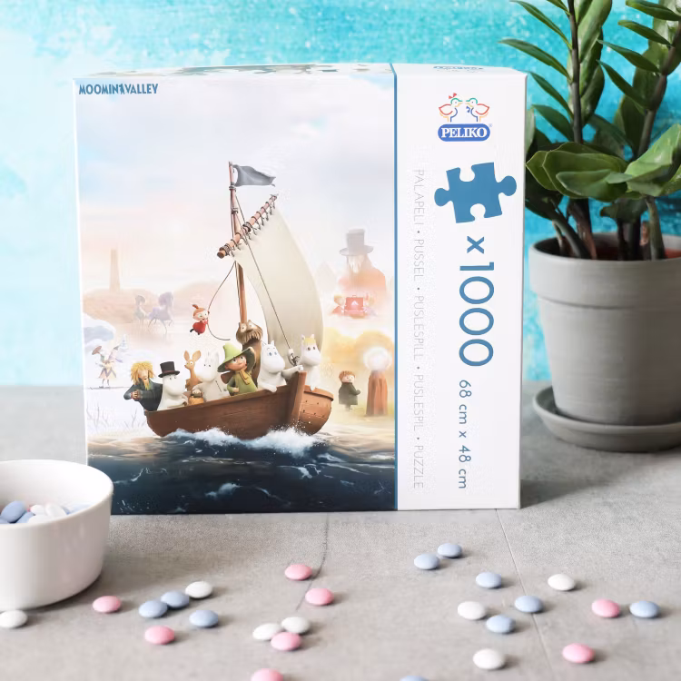 Ett muminpussel med 1000 bitar. Pusslet har ett stämningsfullt motiv från animationsserien Mumindalen. Det lagda pusslets storlek är 68 x 48 cm och pusslet är tillverkat av returkartong. Tillverkningsland Finland.