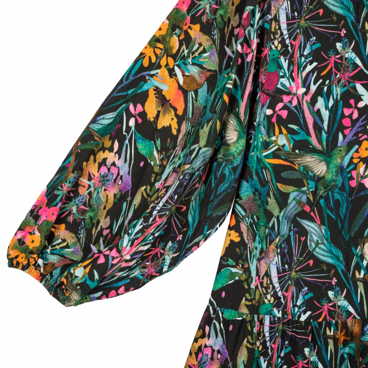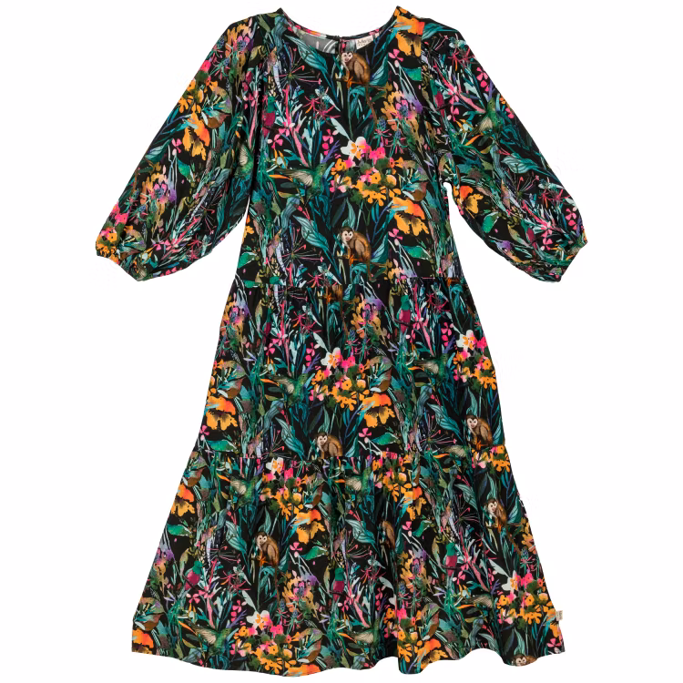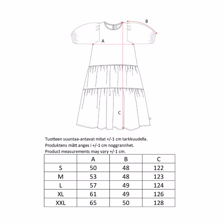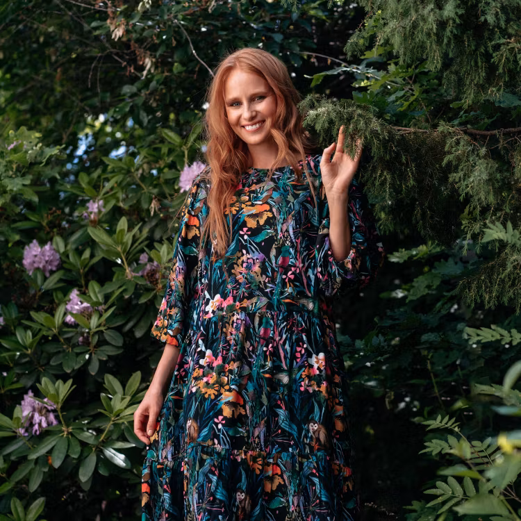 En vacker klänning för damer. Rund halsringning, 1/2-ärmar, knappar i ryggen och en vid kjoldel. Klänningen är tillverkad i EcoVero-viskos. Längd från axel till nederkant i storlek S är 122 cm. Den rödhåriga modellen är 173 cm lång och bär storlek S. Öko-tex.