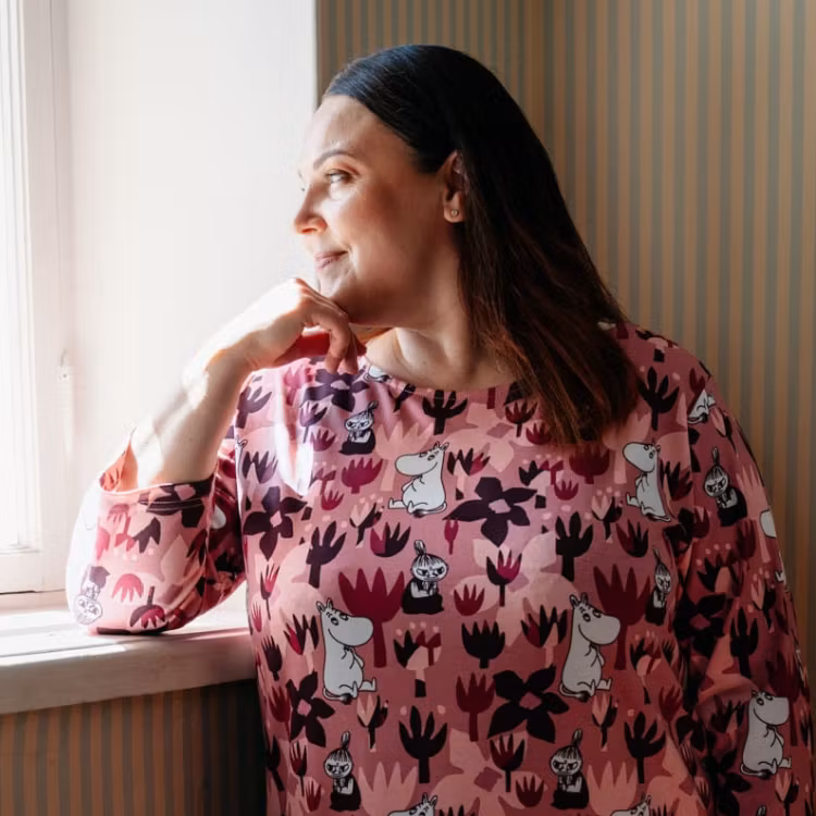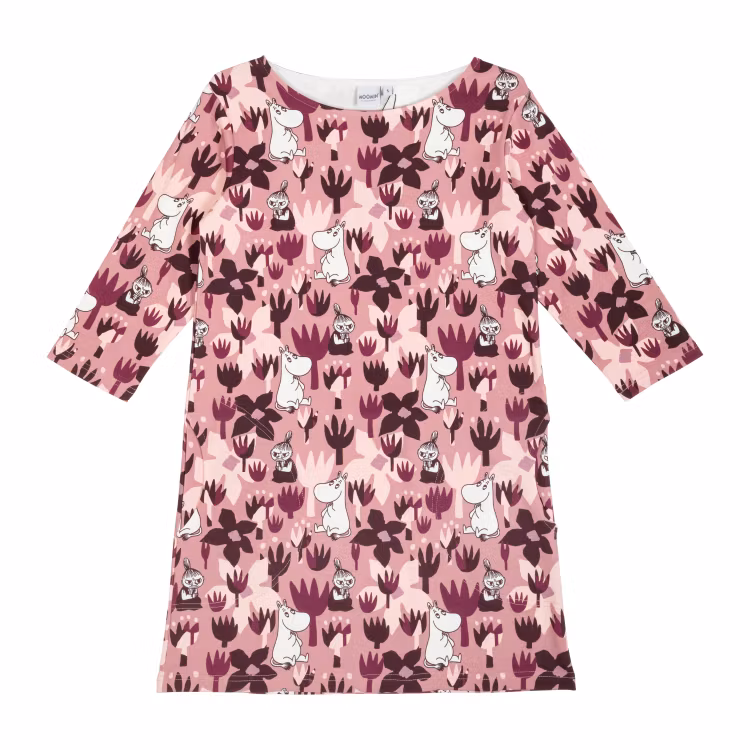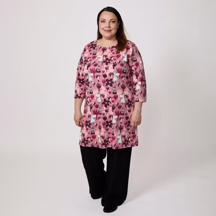 En mjuk och mysig Mumin tunika för damer. Med 3/4-ärmar, en rund halsringning och fickor i sidorna. Längd från axel till nederkant i storlek S är 80 cm. Brunettmodellen är 165 cm lång och bär storlek XXL. Den lockiga, blonda modellen är 166 cm lång och bär storlek M. Den lockiga, blonda modellen är 166 cm lång och bär storlek M. Den lockiga, blonda modellen är 166 cm lång och bär storlek M. Öko-tex.
