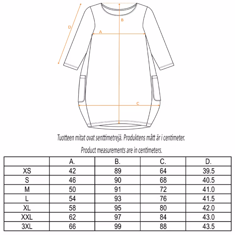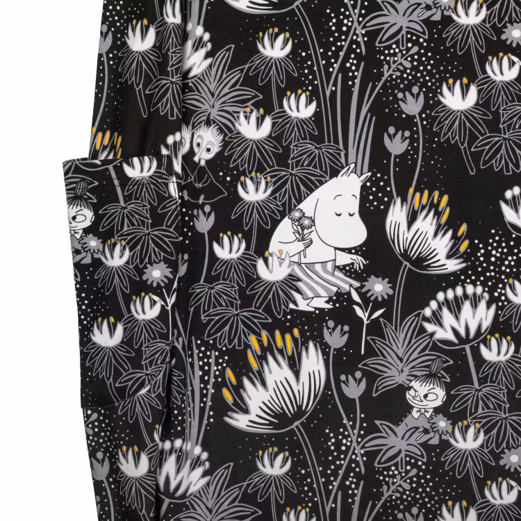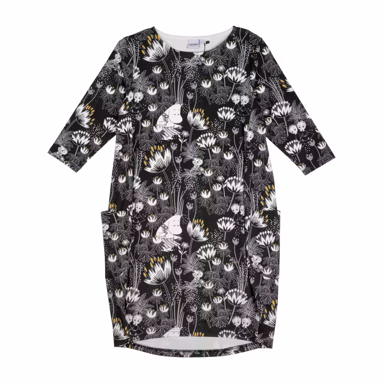 En skön Mumin klänning för damer, i mjuk bomullsmodalblandning. Den lätt droppformade klänningen har 3/4-ärm, rund halsringning och påsydda fickor i sidorna. Längd från axel till nederkant i storlek S är 90 cm. Blond modell är 168 cm lång och bär storlek XXL. Öko-tex.