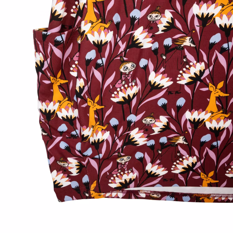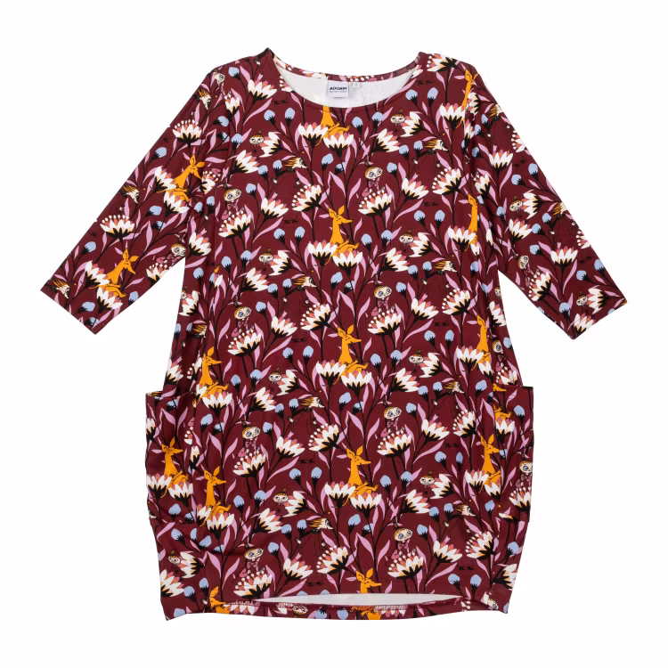 En mjuk och mysig Mumin tunika för damer. Droppformad med 3/4-ärmar, en rund halsringning och fickor i sidorna. Längd från axel till nederkant i storlek S är 80 cm, baklängd 83 cm.