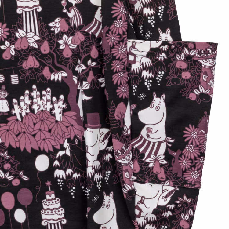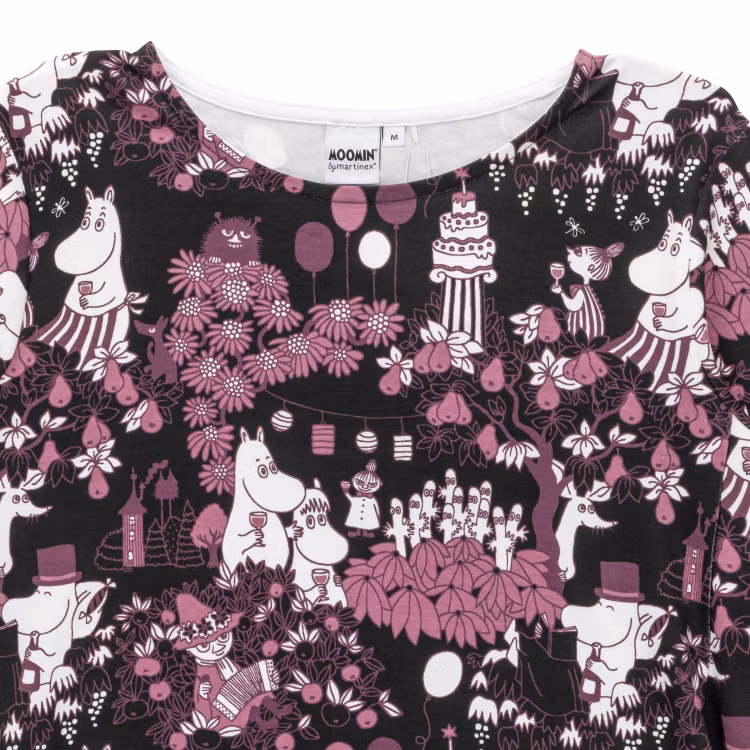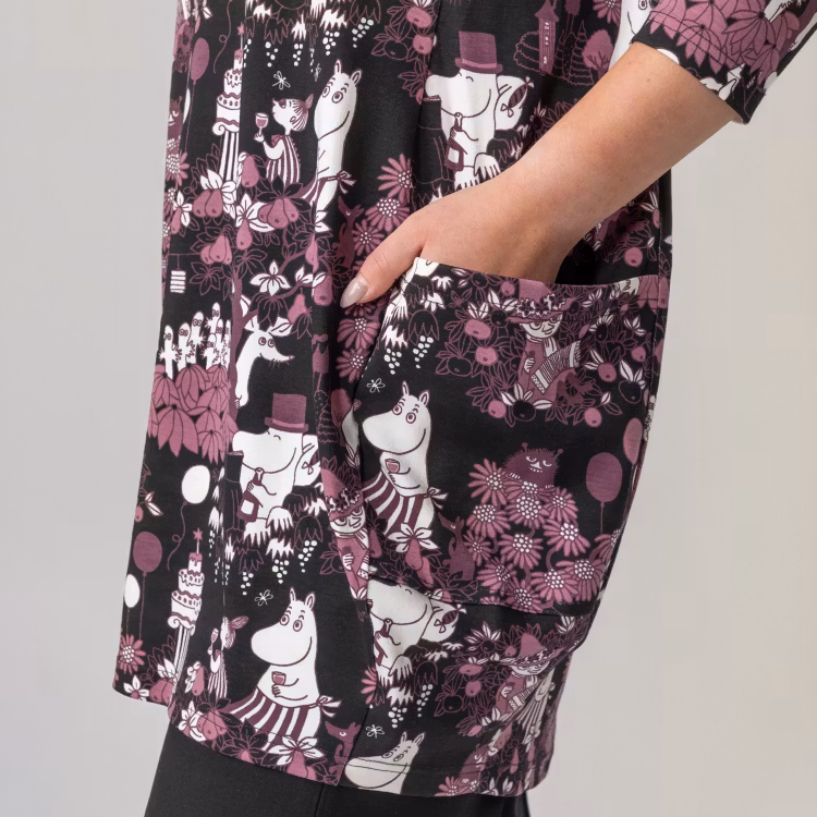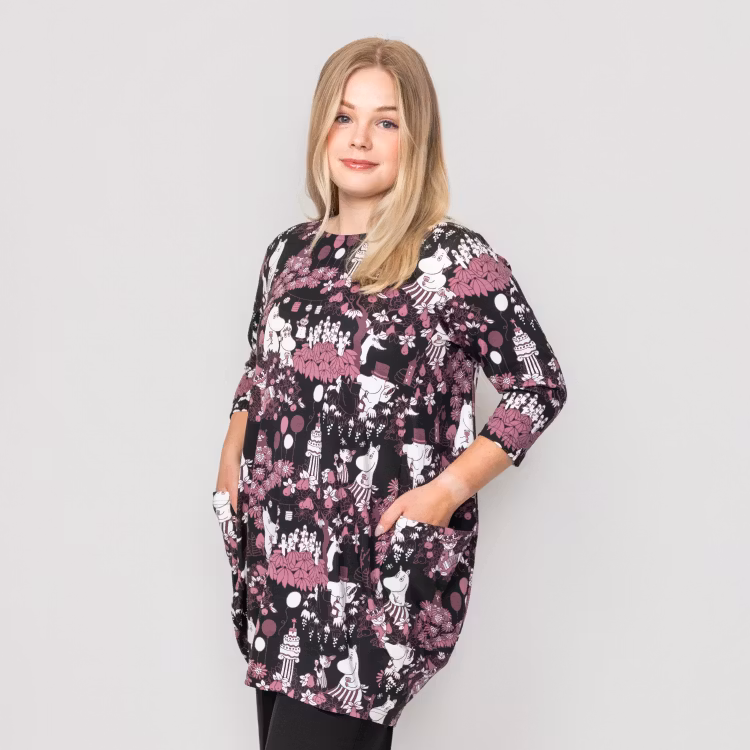 En mjuk och bekväm Mumin tunika för damer, i skön bomullsmodalblandning. Rymlig, droppformad modell med trekvartsärm, rund halsringning, fickor i sidorna och en vackert rundad, lite längre nederkant baktill. Längd från axel till nederkant i storlek S är 80 cm, baktill 83 cm. Öko-tex.