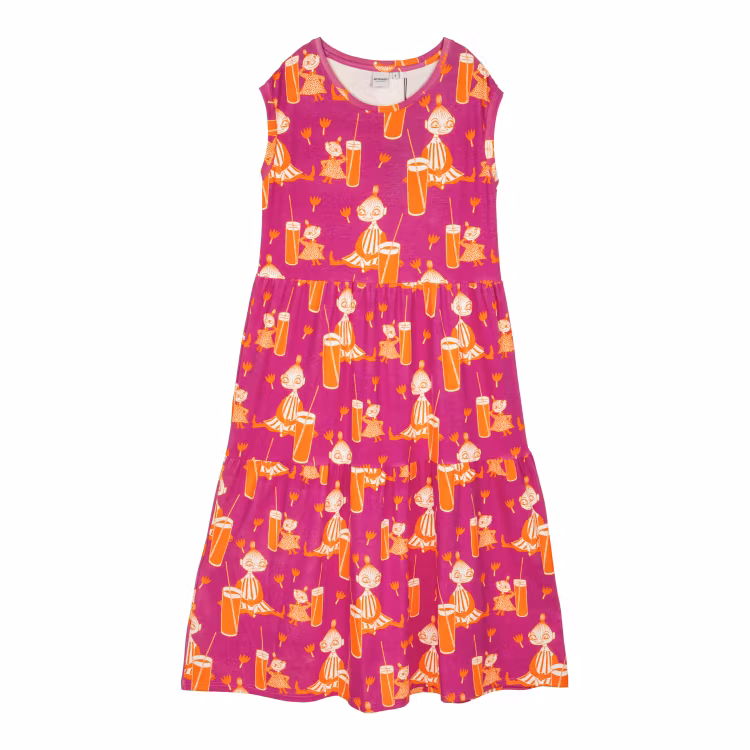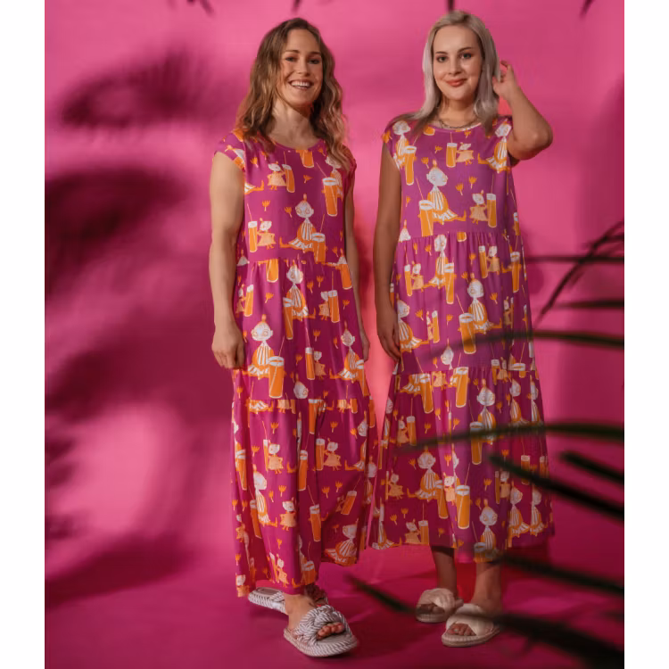 En mjuk och skön Mumin maxiklänning för damer, i bomullsmodalblandning. Klänningen har kort holkärm, rund halsringning och en vackert fallande kjoldel avskuren med rynkning. Längd från axel till nederkant i storlek S är 127 cm. Den lockiga modellen är 168 cm lång och bär storlek S. Den rakhåriga modellen är 174 cm lång och bär storlek S. Öko-tex.