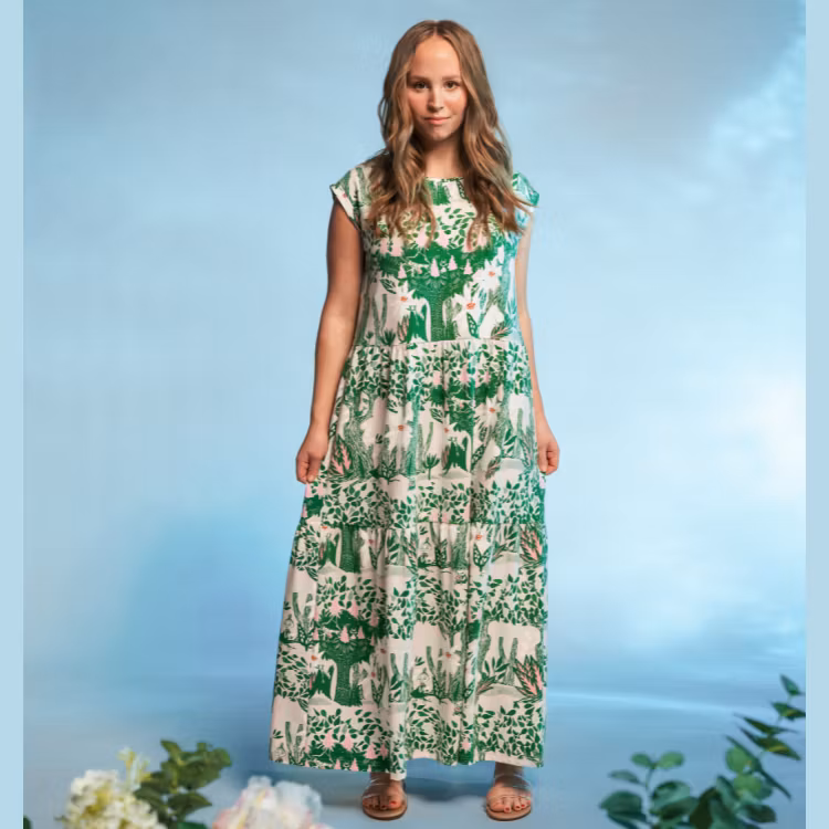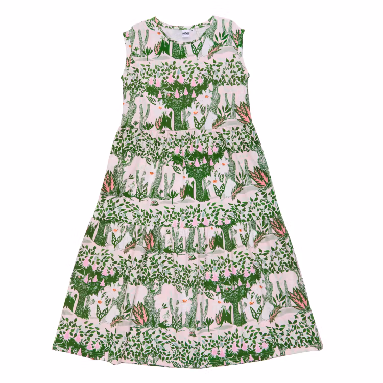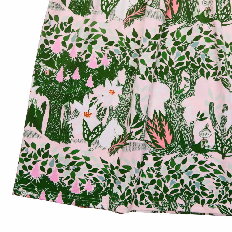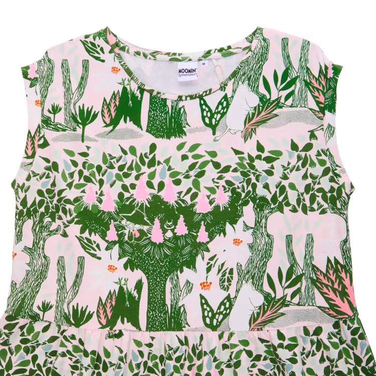 En mjuk och skön Mumin maxiklänning för damer, i bomullsmodalblandning. Klänningen har kort holkärm, rund halsringning och en vackert fallande kjoldel avskuren med rynkning. Längd från axel till nederkant i storlek S är 127 cm. Modellen är 165 cm lång och bär storlek M.