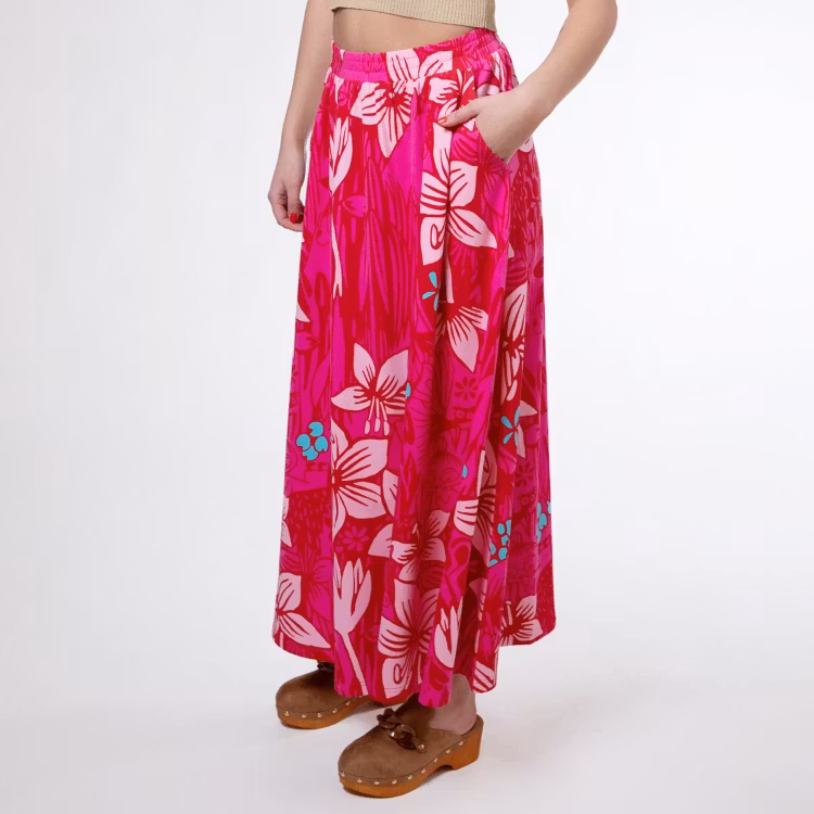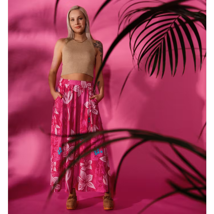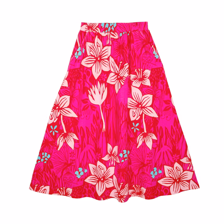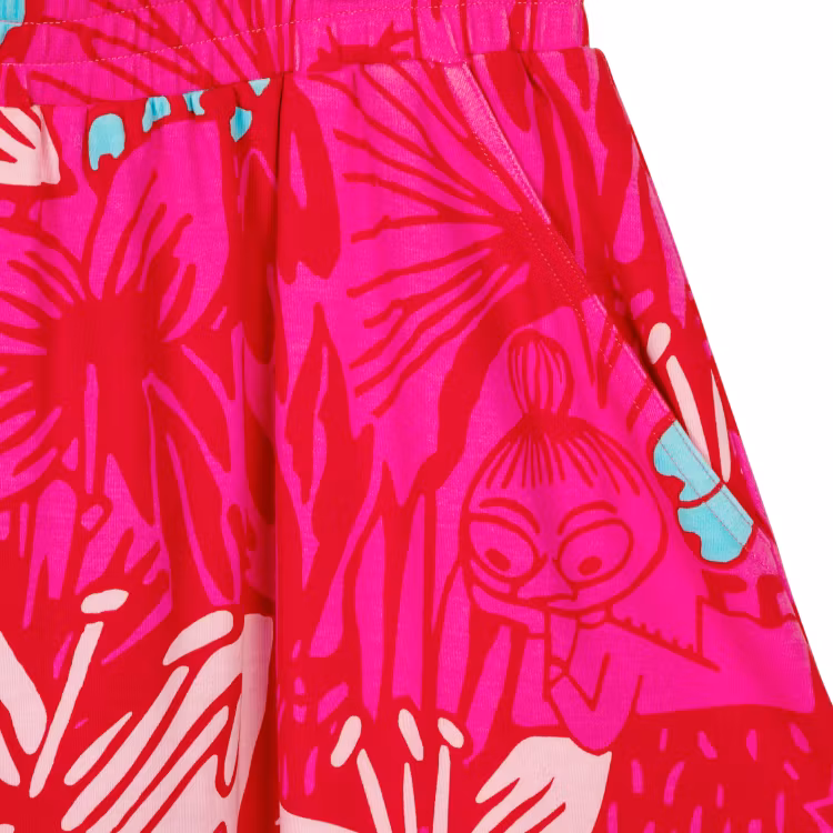 En mjuk och skön Mumin kjol för damer, i bomullsmodalblandning. Den ankellånga kjolen har infälld resår i midjan och fickor i sidorna. Längd i storlek S är 94 cm. Den lockiga modellen är 168 cm lång och bär storlek S. Öko-tex.