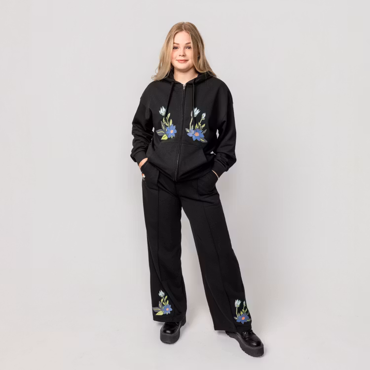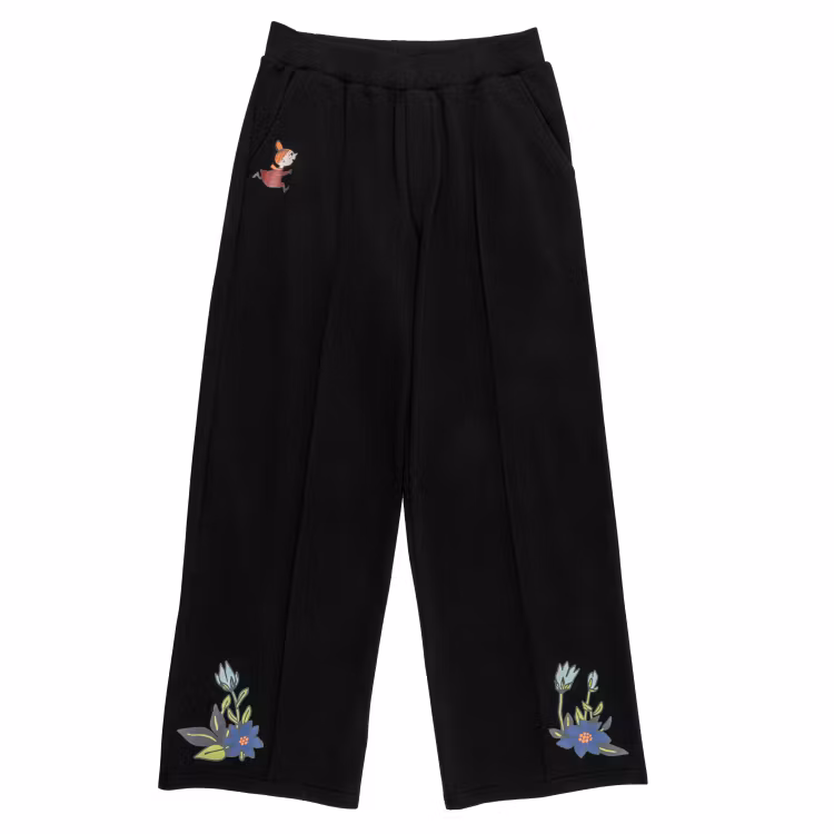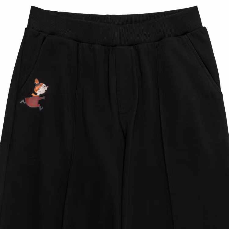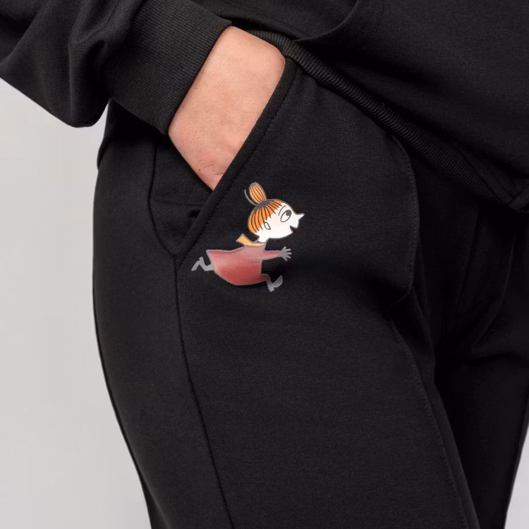 En mjuk och skön Mumin collegebyxa för damer. Byxan har raka ben med smala sydda veck, fickor, infälld resår i midjan, fuskgylf, samt fina tryck på båda benen. Byxans sidolängd i storlek S är 106 cm. Öko-tex.