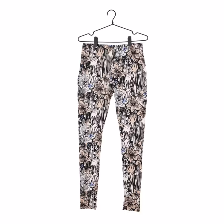 Sköna helmönstrade leggings med muminfigurer på en blommande äng i en dämpad färgskala av ljus sand, mörkare sand, ljusblått och svart. I midjan har leggingsen infälld resår. Öko-tex.