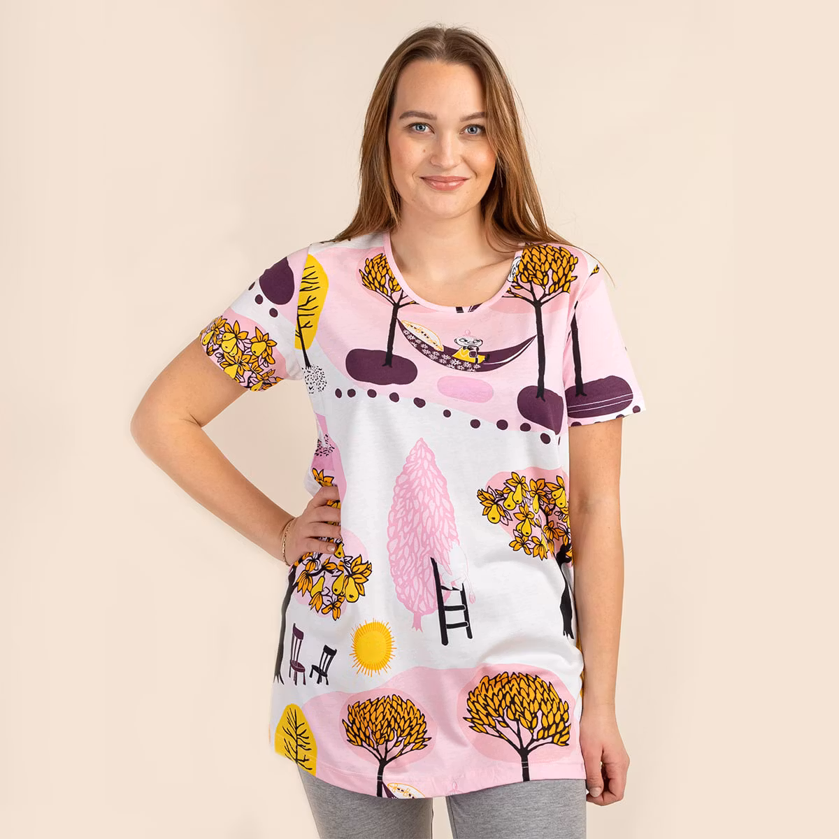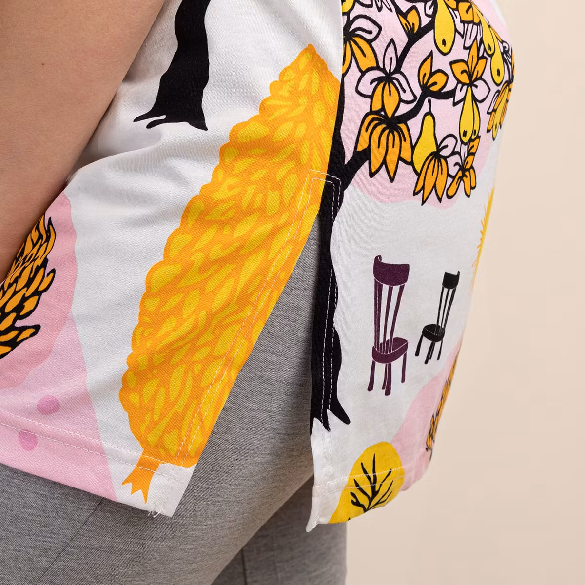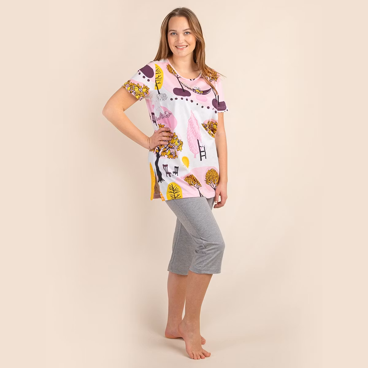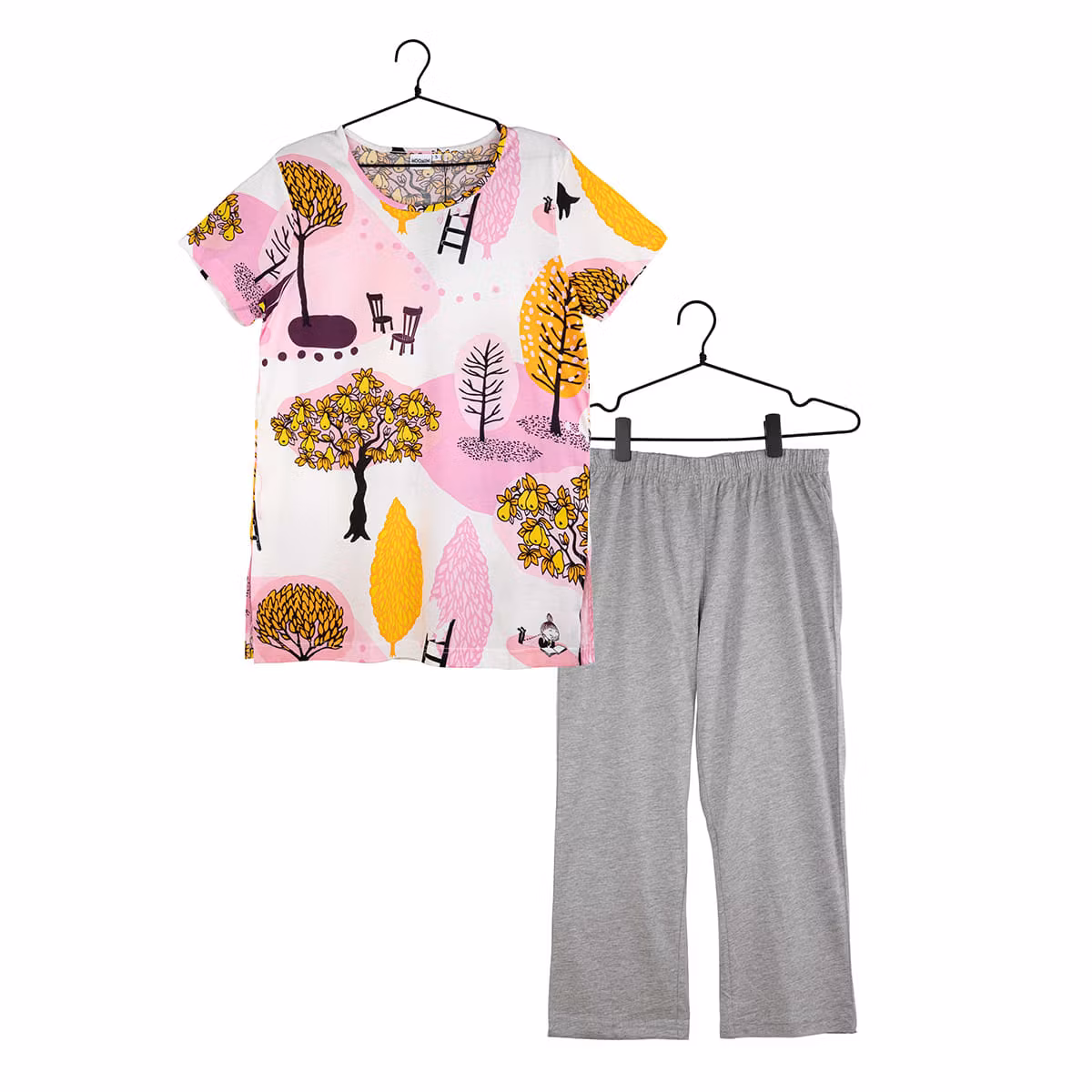 En kortärmad, tvådelad pyjamas i skön bomullsmodalblandning. Pyjamaströjan är vit och helmönstrad med Muminfigurer som chillar bland träden i Mumindalen, i vackra nyanser av lila och gult. Tröjan har rund halsringning och sprund i sidorna nedtill. Byxan är ljusgråmelerad, i caprilängd med infälld resår i midjan. Tröjan är 79 cm och byxan är 76 cm i storlek M. Öko-tex.