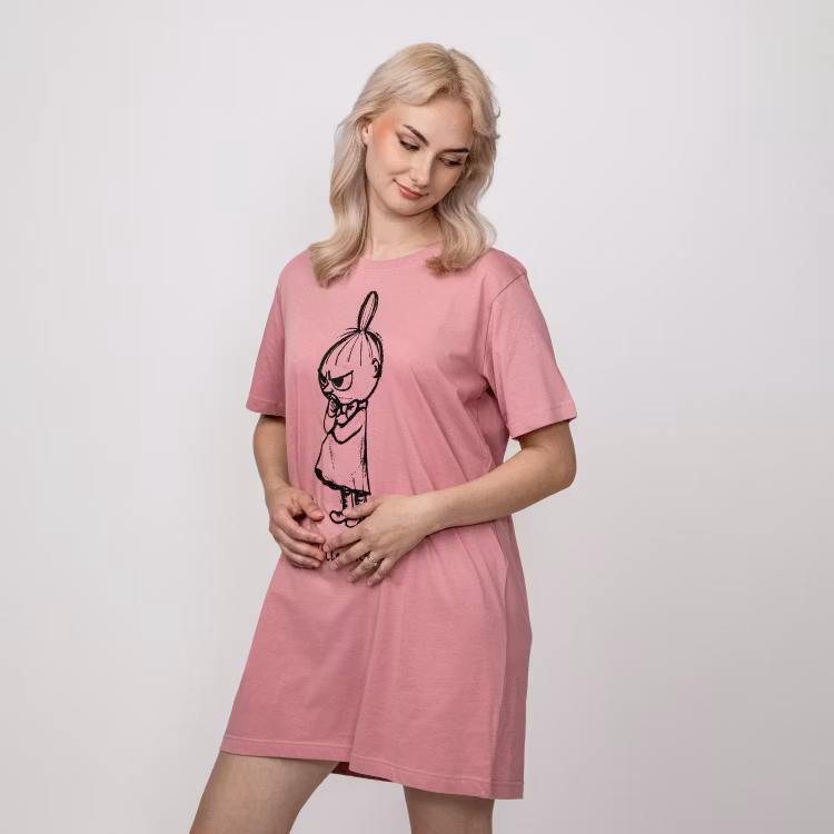 Ett mjukt och skönt Mumin nattlinne för damer, i rak modell med kort ärm och rund halsringning. Framtill ett tryck av den buttra Lilla My med texten 'Little My'. Längd från axel till nederkant i storlek S är 84 cm. Tillverkad i mjuk bomull. Öko-tex. Modellen är 173 cm lång och bär storlek M.