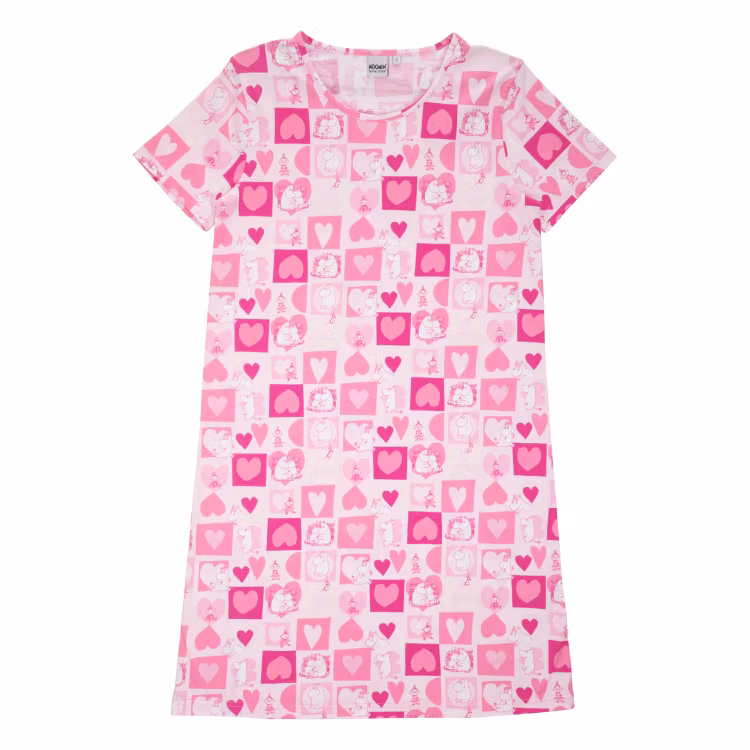 Ett Mumin nattlinne tillverkat i mjuk bomull. Helmönstrat med kort ärm och rund halsringning. Längd från axel till nederkant i storlek S är 99 cm.