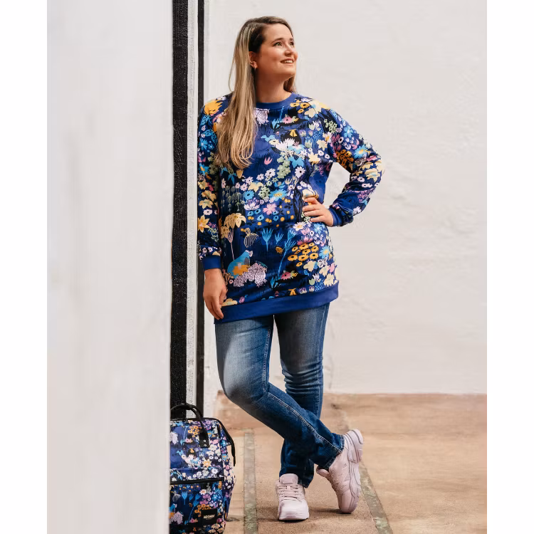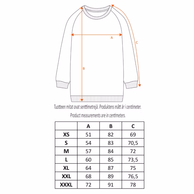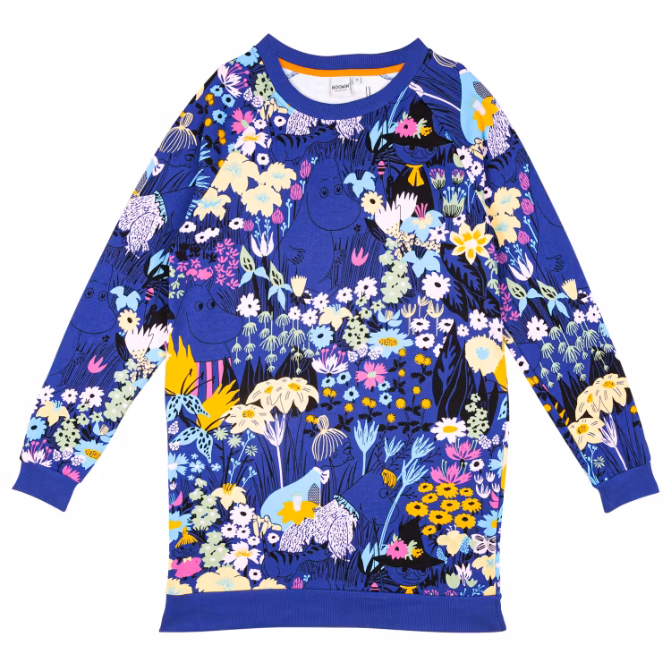 En mjuk och mysig Mumin collegetunika för damer. Med långa raglan-ärmar och en rund halsringning. Längd från axel till nederkant i storlek S är 83 cm. Mörkhårig modell är 173 cm lång och bär storlek S. Ljushårig modell är 175 cm lång och bär storlek L. Öko-tex.