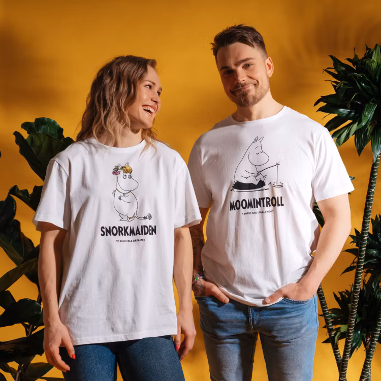 En fin Mumin t-shirt för vuxna. T-shirten är benvit, i rak unisex-modell med kort ärm och rund halsringning. I nacken finns frågan 'Which Moomin character are you?' och framtill finns det engelska namnet på favoritfiguren, tillsammans med en bild på den. Tillverkad i 100% bomull. Den rakhåriga modellen är 174 cm lång och bär storlek S. Öko-tex.