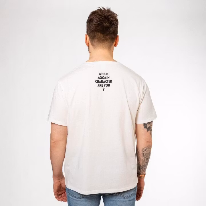 En fin Mumin t-shirt för vuxna. T-shirten är benvit, i rak unisex-modell med kort ärm och rund halsringning. I nacken finns frågan 'Which Moomin character are you?' och framtill finns det engelska namnet på favoritfiguren, tillsammans med en bild på den. Tillverkad i 100% bomull. Den rakhåriga modellen är 174 cm lång och bär storlek S. Öko-tex.