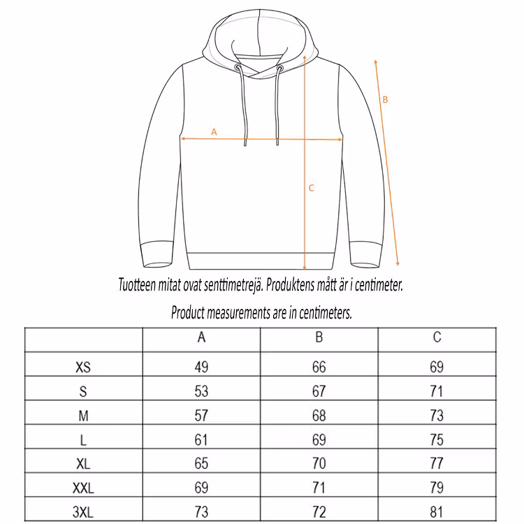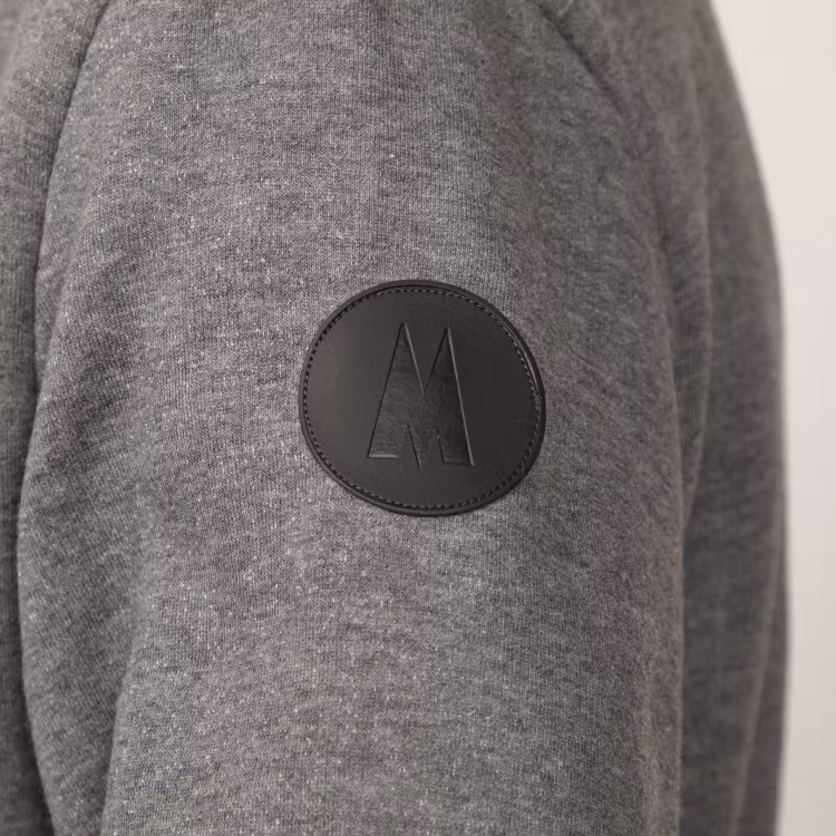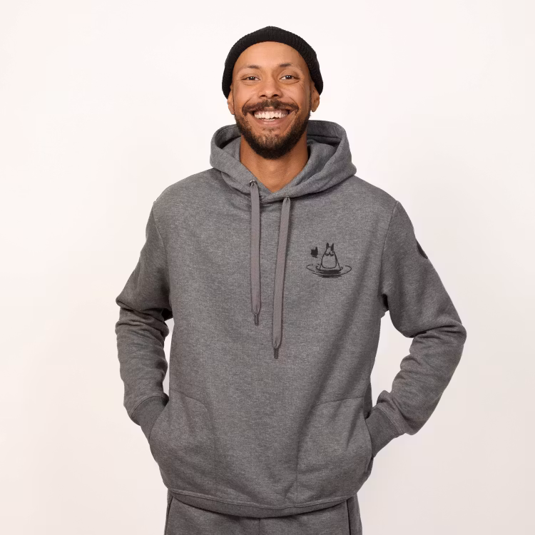 En mörkgrå huvtröja i skön sweatshirtkvalitet av BCI-bomullsblandning, i herrmodell. På den vänstra sidan har tröjan en liten broderad bild av Muminpappan som tagit sig ett dopp och tappat hatten… I nederkant och ärmslut finns det ribbad mudd och insidan av tröjan är mjuk och borstad. Den fodrade huvan har dragsko. Axel till nederkant i storlek S: 70 cm. Öko-tex.