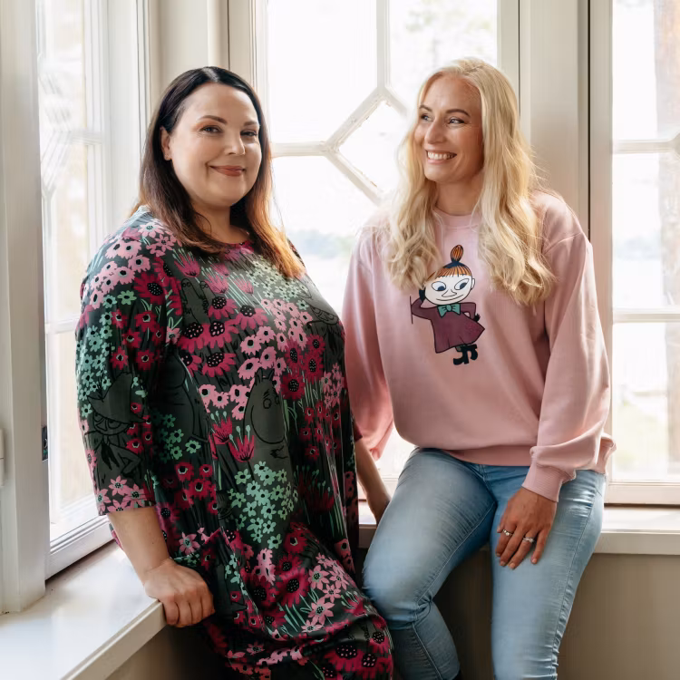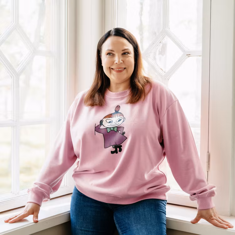 En mjuk och mysig Mumin collegetröja för damer. Oversize-modell med långa ärmar och en rund halsringning. Längd från axel till nederkant i storlek S är 62 cm. Brunettmodellen är 165 cm lång och bär storlek XXL. Den lockiga, blonda modellen är 166 cm lång och bär storlek M. Öko-tex.