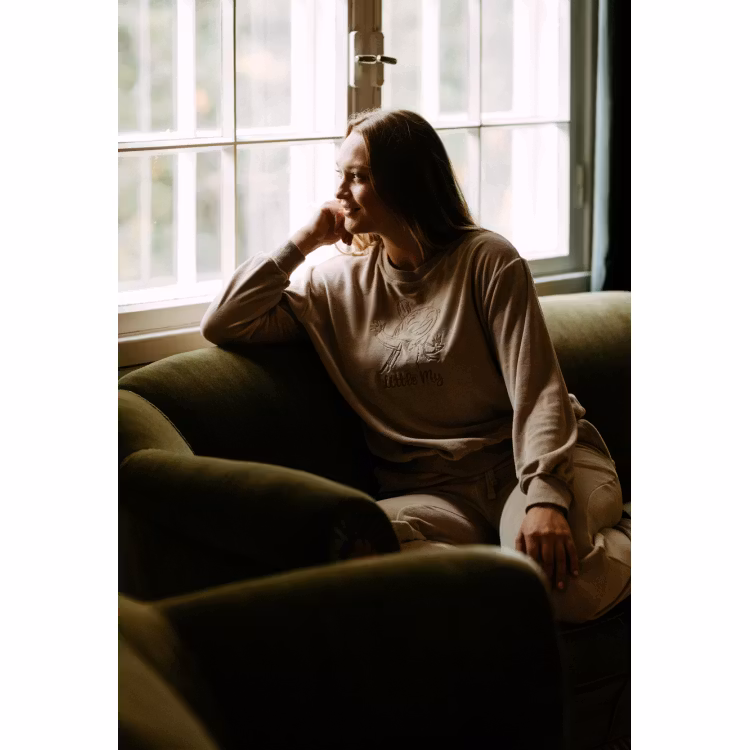 En krämigt lattebrun velourtröja av BCI-bomull och återvunnen polyester. Tröjan är sydd i rymlig oversized-modell med nedhasad axelsöm. Framtill finns det en broderad bild av den glada Lilla My i mörkbeige, tillsammans med texten Little My i snirklig skrivstil. I ärmslut och nederkant finns det ribbad mudd. Längd: 62 cm från axel till nederkant i storlek S. BCI-bomull och återvunnen polyester. Öko-tex.