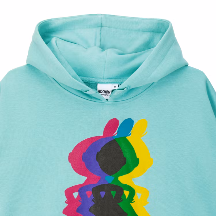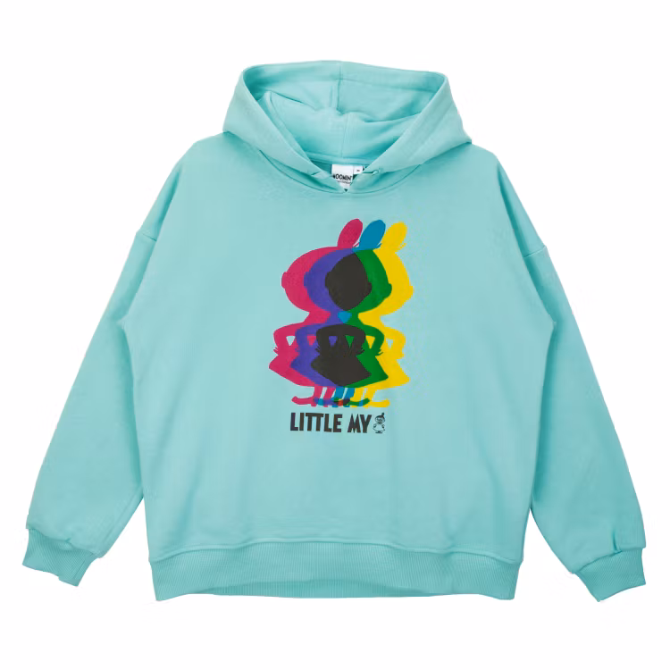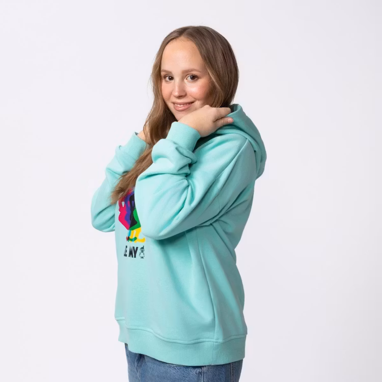 En mjuk och mysig Mumin huvtröja för damer. I oversized modell med lång ärm och fodrad huva. Längd från axel till nederkant i storlek S är 65 cm. Modellen är 165 cm lång och bär storlek M.