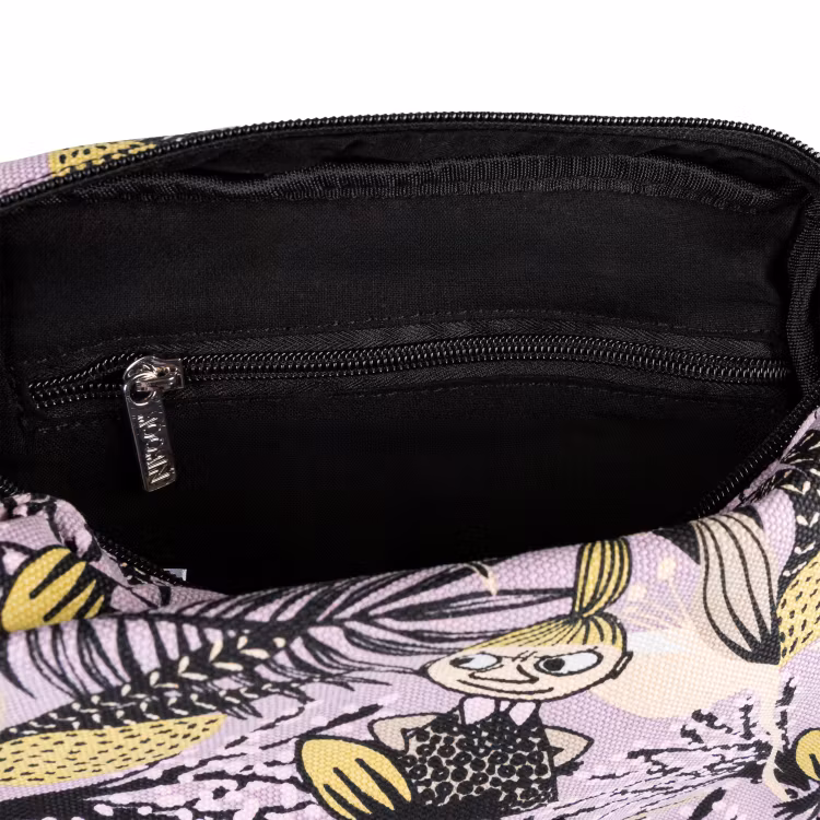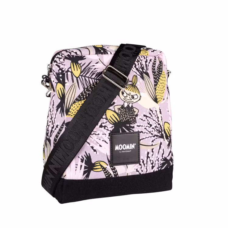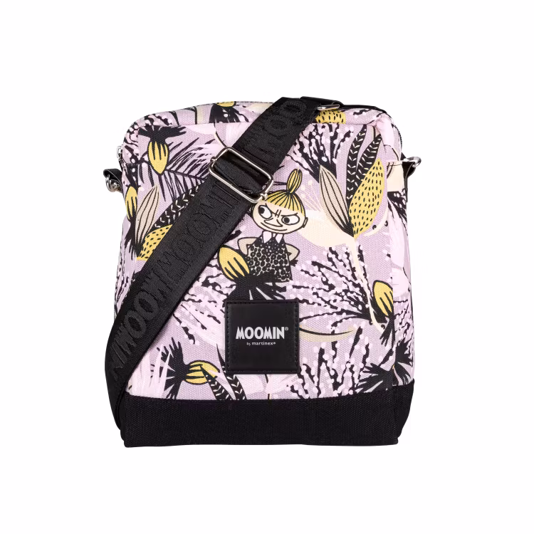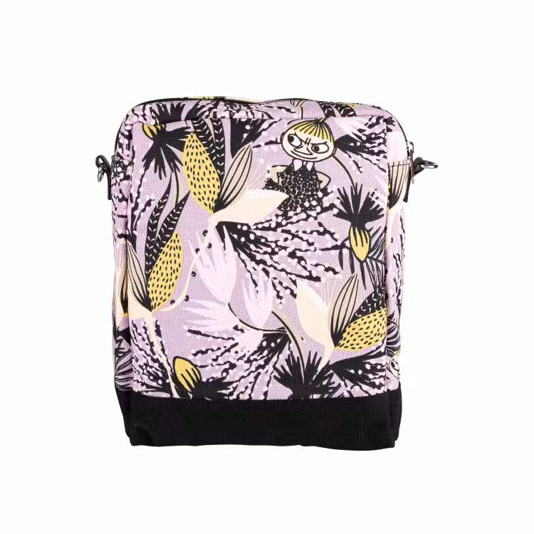En vacker muminväska i praktisk storlek. Väskan har blixtlås upptill, en innerficka med blixtlås och en bred, justerbar axelrem (143 cm). Tillverkad av stadig bomullscanvas. Alla väskorna är olika i trycket och ingen väska är den andra lik.